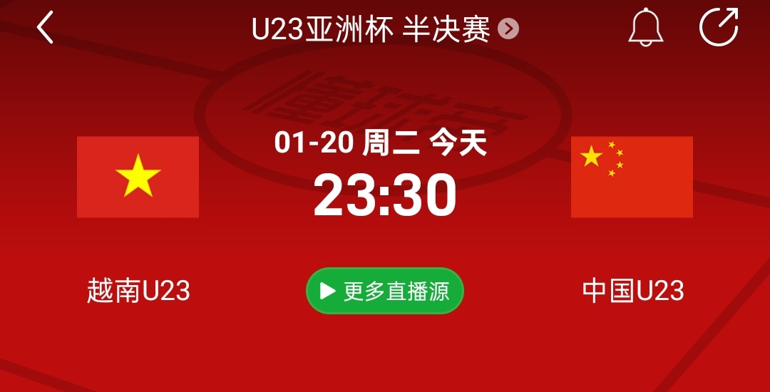 一起为国足加油!为梦而战比赛时间:1月20日23:30(23:15开播)越南U23VS中国U23