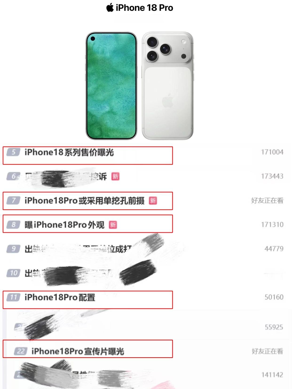 今天iPhone怎么上了这么多热搜? 今天刷热搜时吓了一跳,iPhone18Pro相关话题直接刷屏了,什么曝光、外观、配置、单挖孔前摄...一口气上了好几条! 苹果这是憋了个大招啊?离发布还早呢就开始预热了?还是又有数码猛料泄露了? 感觉今年数码圈要炸,红米Turbo5 Max的9000mAh电池、OPPO Find X9 Ultra的双2亿像素、再加上iPhone18系列,不要太热闹。