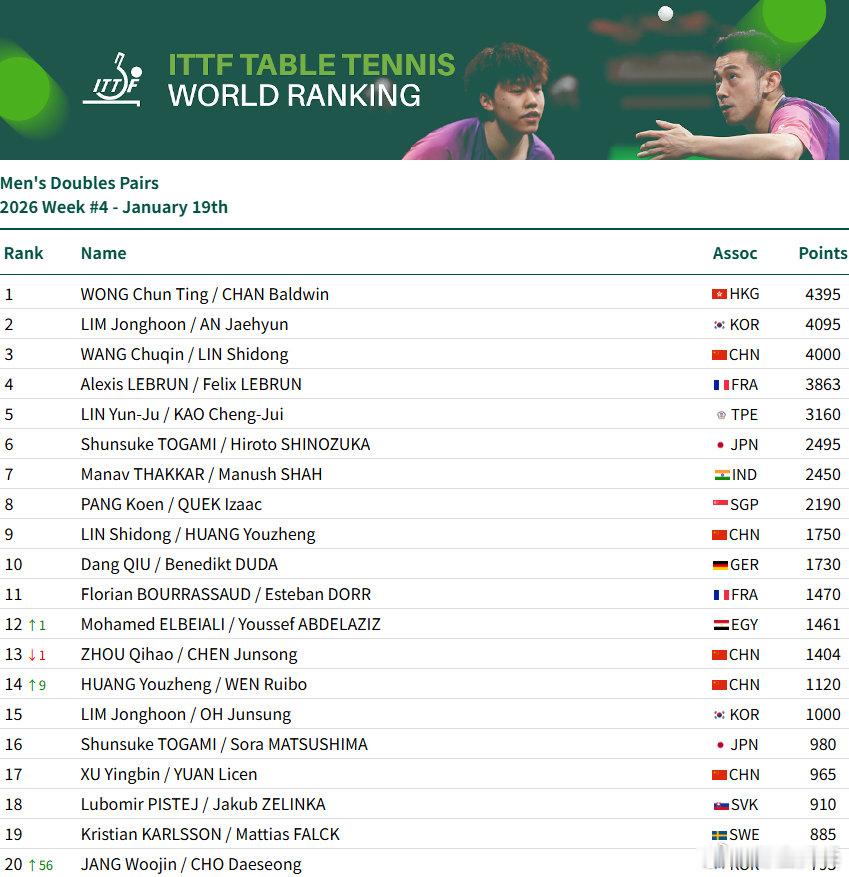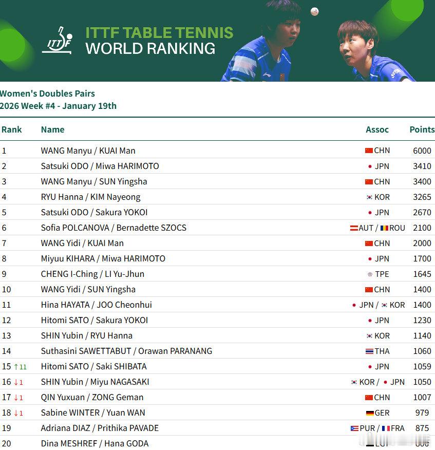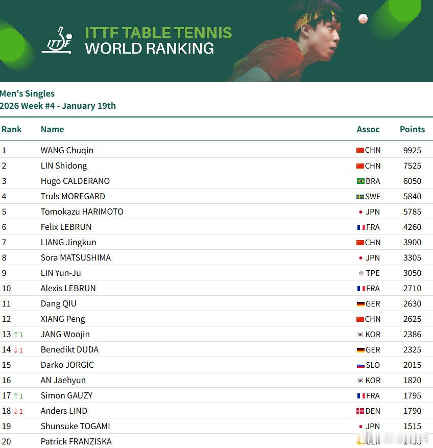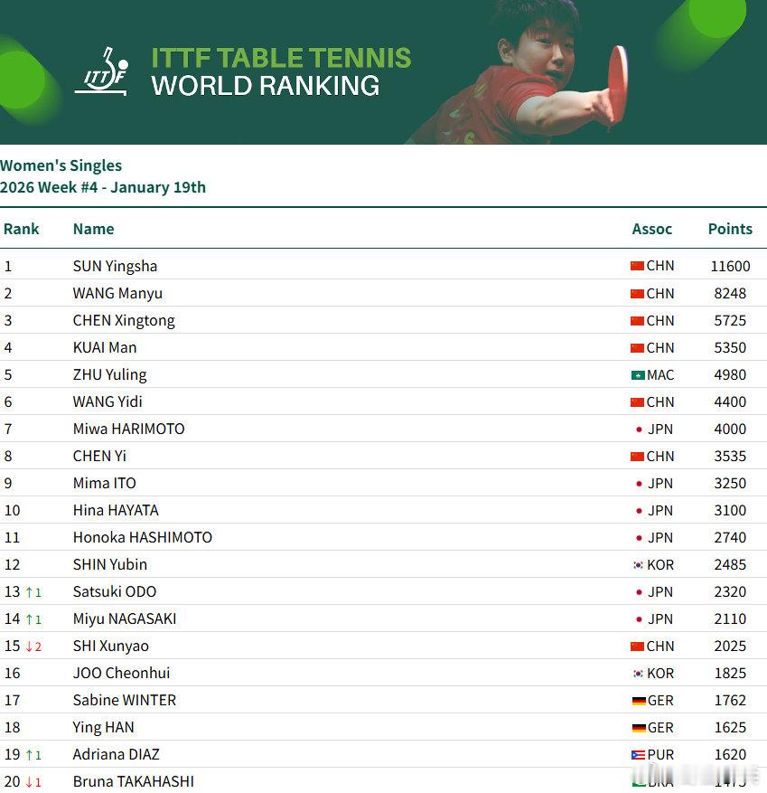 国际乒联2026第四周排名男单:王楚钦9925分、林诗栋位列前二,梁靖崑位列第7,向鹏第12女单:孙颖莎11600分、王曼昱、陈幸同、蒯曼位居前四,朱雨玲第5、王艺迪第6、陈熠第8男双:王楚钦/林诗栋第3、林诗栋/黄友政第9、女双:王曼昱/蒯曼第一、孙颖莎/王曼昱第3、蒯曼/王艺迪第7、孙颖莎/王艺迪第10混双:林诗栋/蒯曼第1、王楚钦/孙颖莎第3、黄友政/陈熠第10黄友政温瑞博上升9位看WTT上咪咕