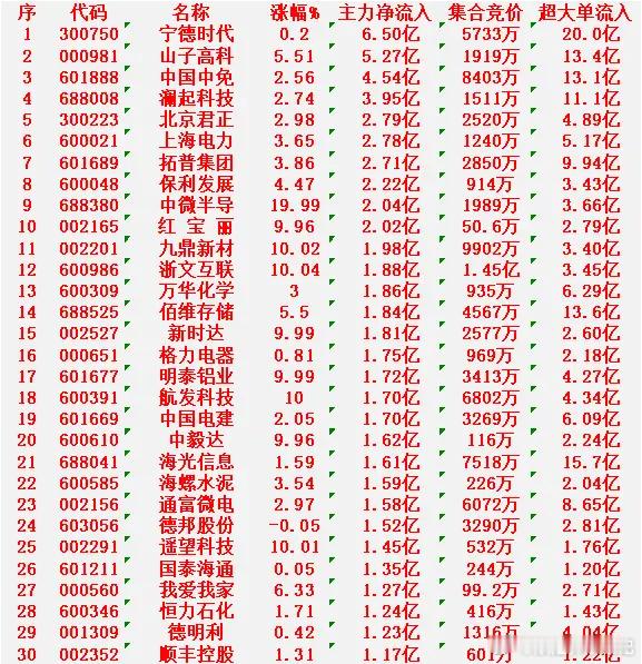 1月20日开盘45分钟主力资金抢筹榜TOP30出炉!宁德时代领衔吸金,净流入6.50亿元;山子高科紧随其后,净流入5.27亿元;中国中免获4.54亿元主力加仓,澜起科技净流入3.95亿元,北京君正亦获2.79亿元主力资金布局。