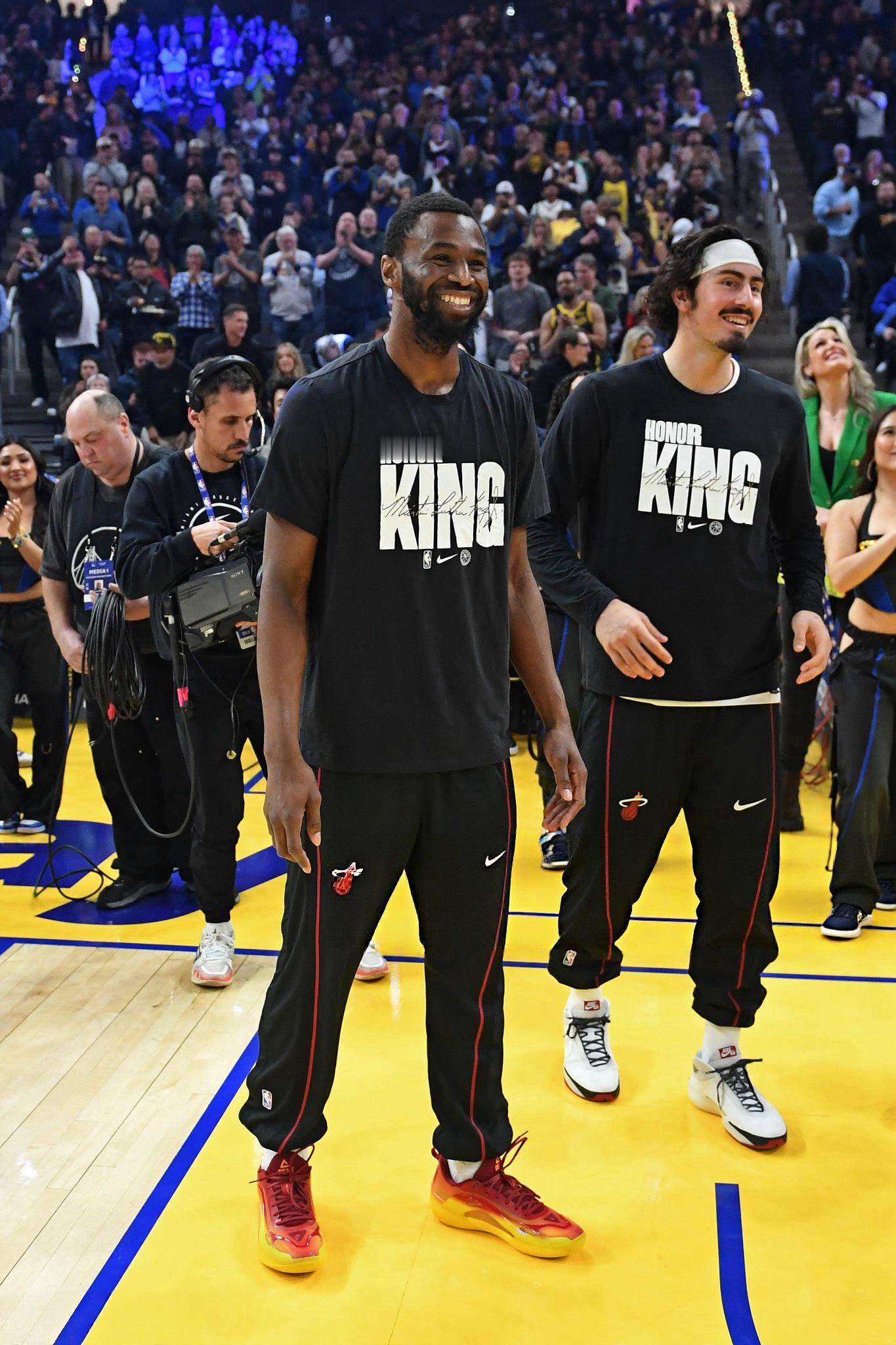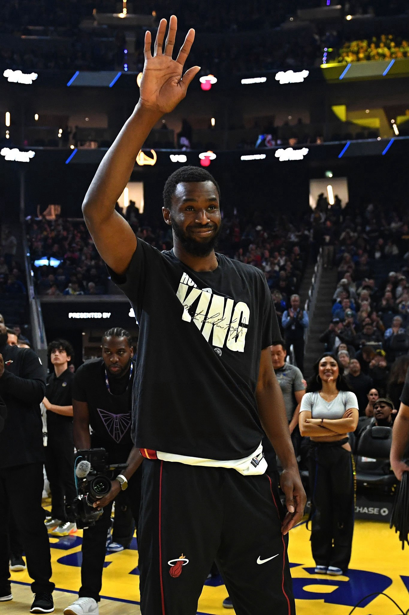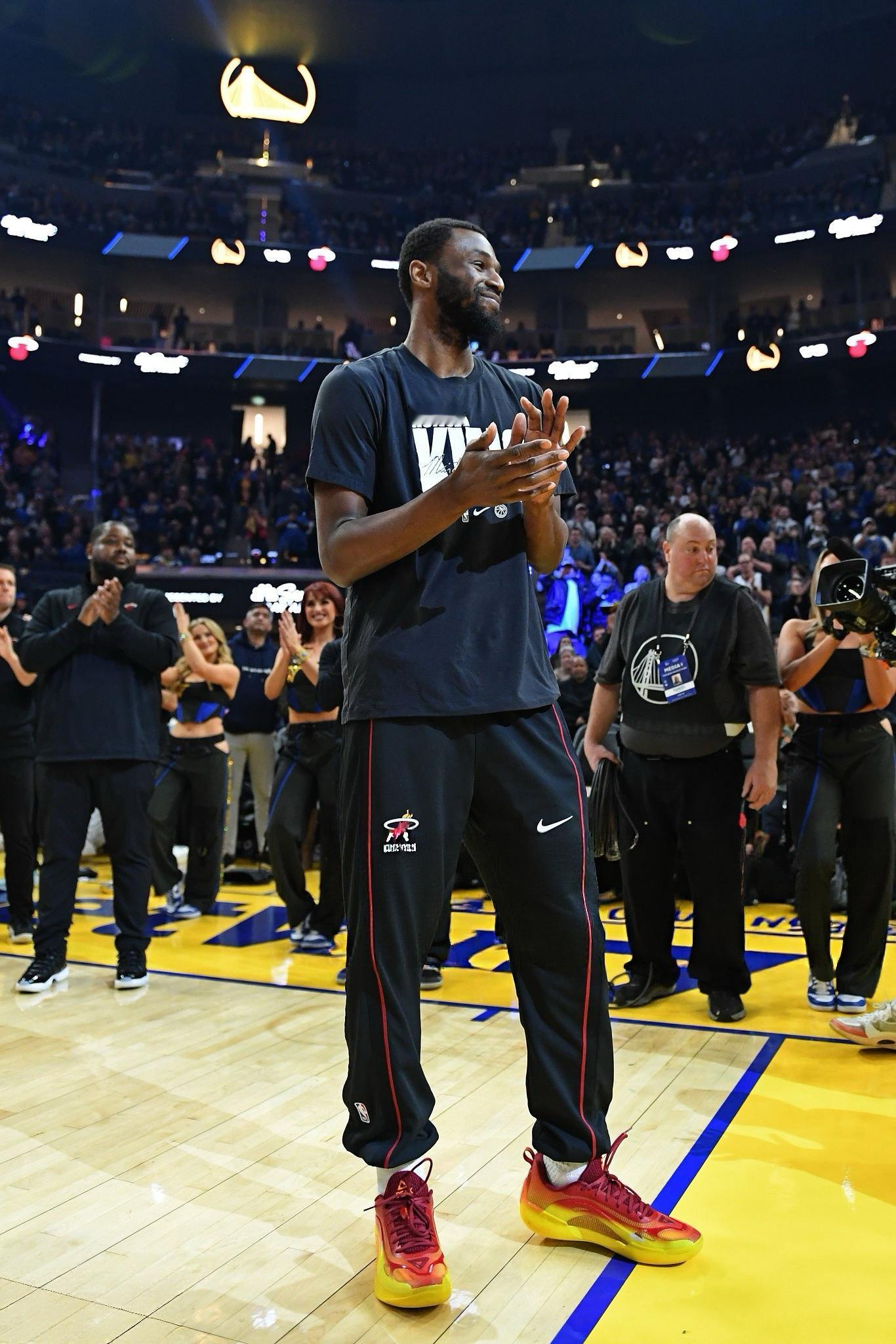 嘴哥带着他温暖的笑容回到了大通中心嘴嫂也在现场观看嘴哥的比赛热火vs勇士库里本赛季全明星最老首发