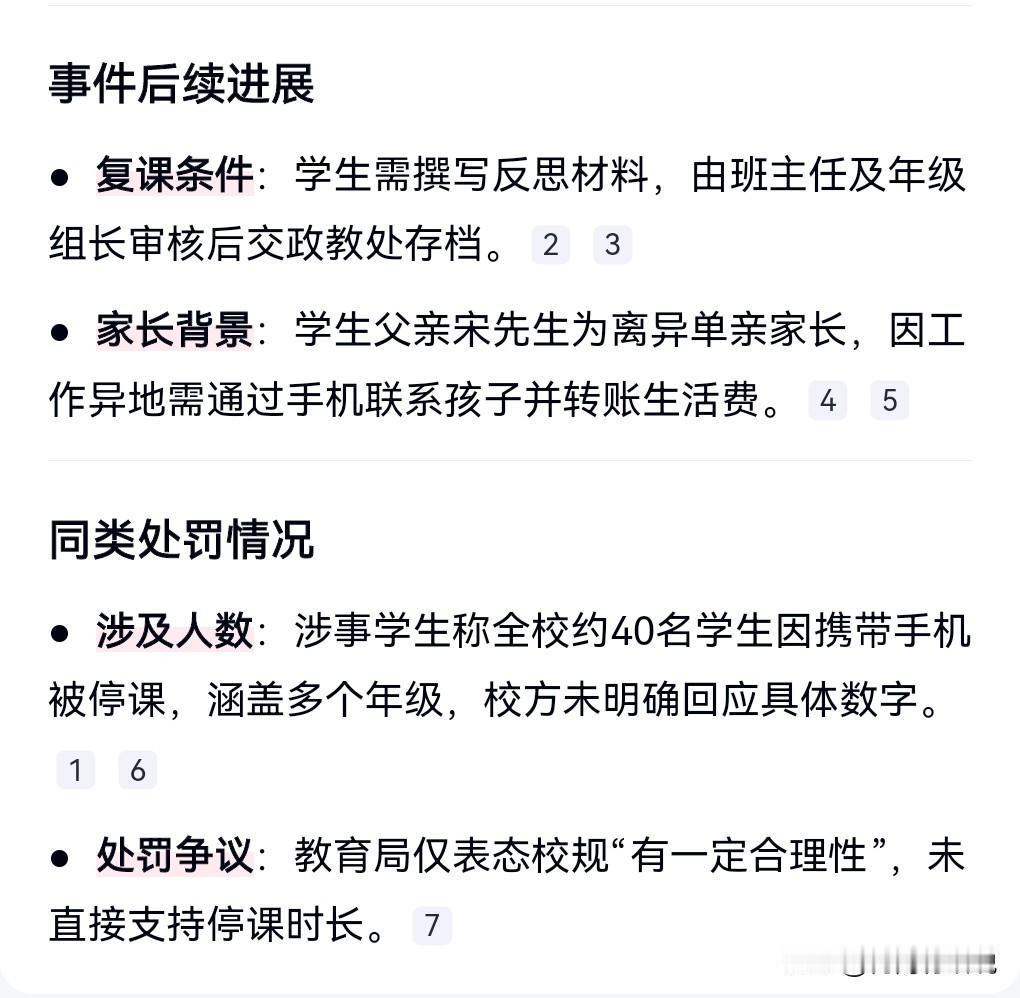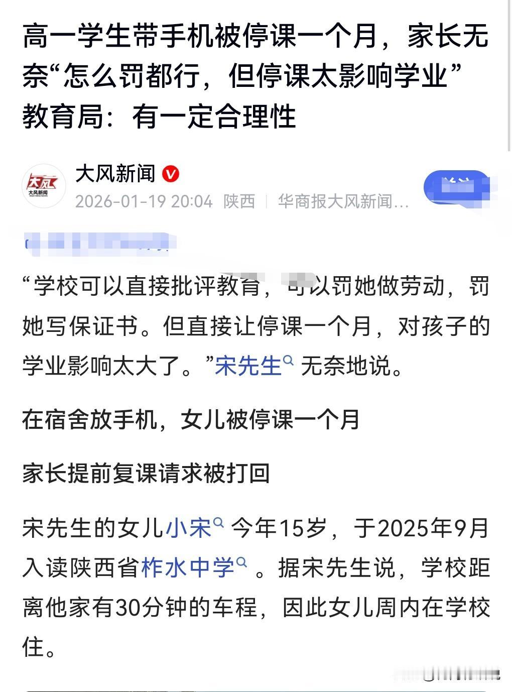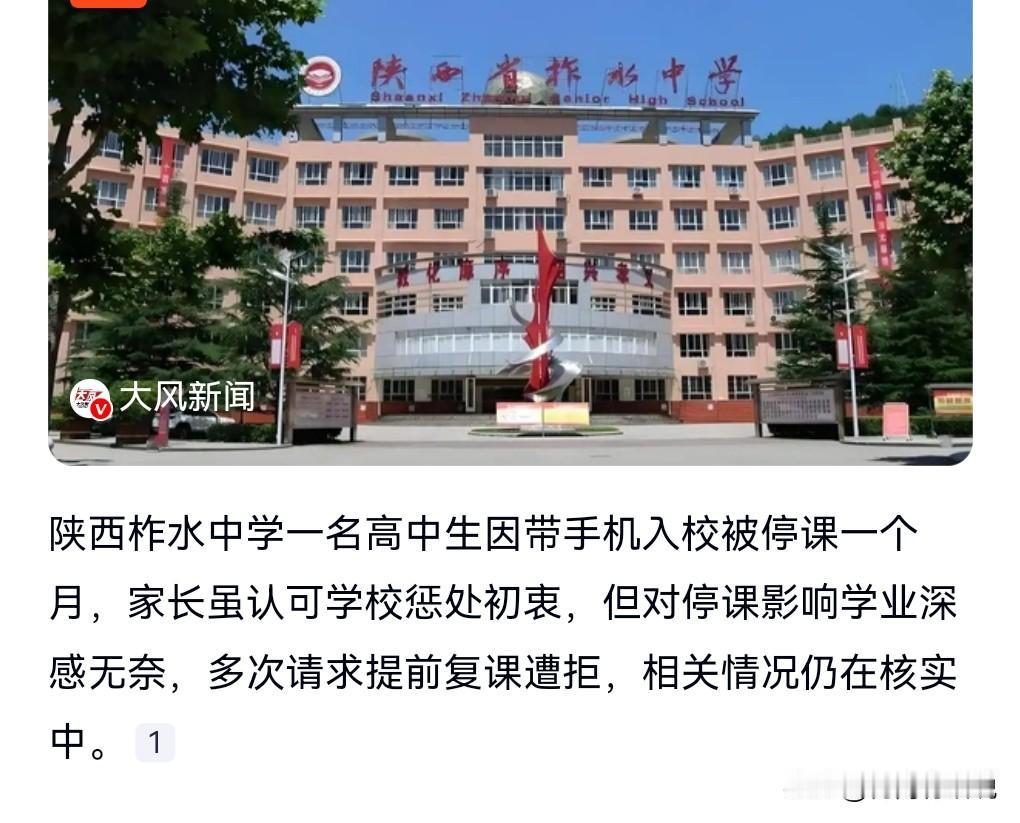 这学校也太狠了吧。 1月20日热搜,高中生带手机被停课1个月,家长无奈。 这学生的成绩进步了不少,如果停课一个月,那影响确实太大了。 而且有个特殊情况,是个离异的家庭,孩子的父亲在外地工作,需要通过手机给孩子转生活费。 而且当时发现手机的地方是在学校的宿舍,又没带到课堂。 虽说没有规矩不成方圆。 我感觉学停课一个月太过严重了,没有考虑到学生需要用手机来接收生活费的情况。高中生带手机被停课1个月 家长无奈