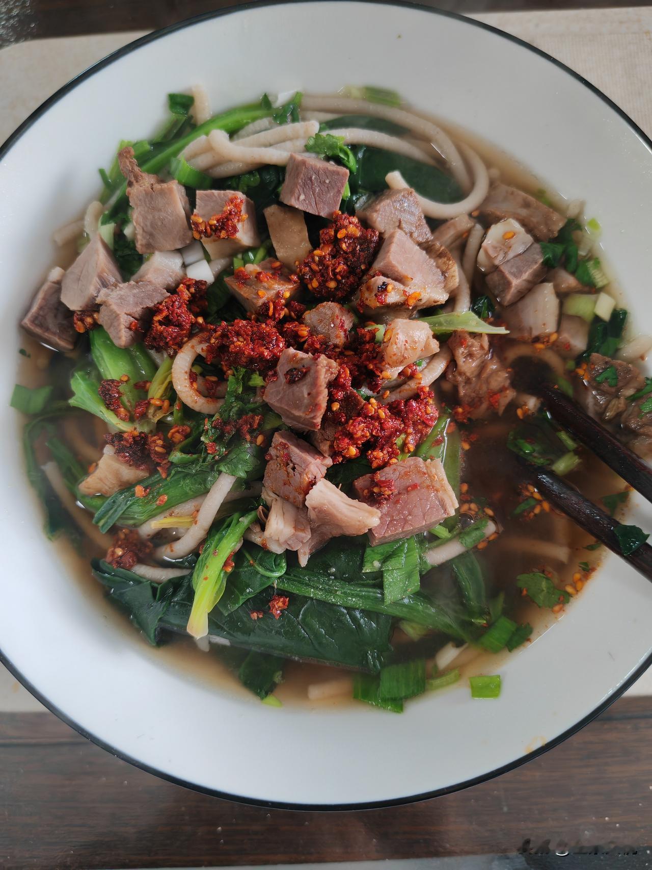 家里自做的牛肉面和荞面牛肉饸饹比外面店里的好吃不知多少倍! 星期六煮了一锅牛肉,和老伴儿两个人今天总算是把牛肉汤吃完了。家里做的牛肉面吃起来就是香,看来外面店里的兰州牛肉面多数都没有牛肉原汤,大部分都是香料勾兑的汤。吃牛肉面要实现牛肉自由、味道好,就得自己在家煮牛肉,这是兰州牛肉面最基本的,有肉没肉不要紧,关键是要用煮的牛肉汤。 大家看看怎么样吧?饸饹面馆 荞饸饹面