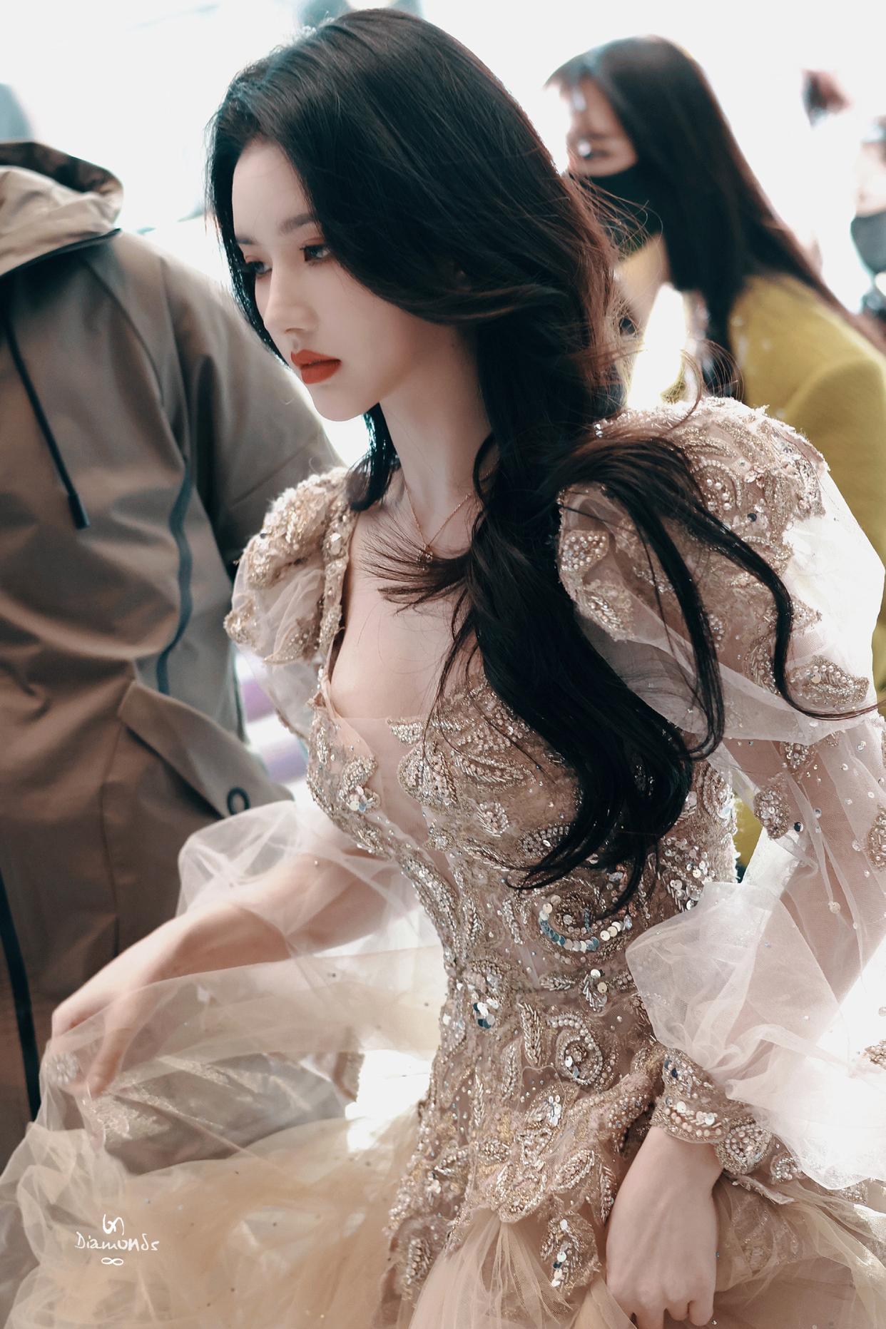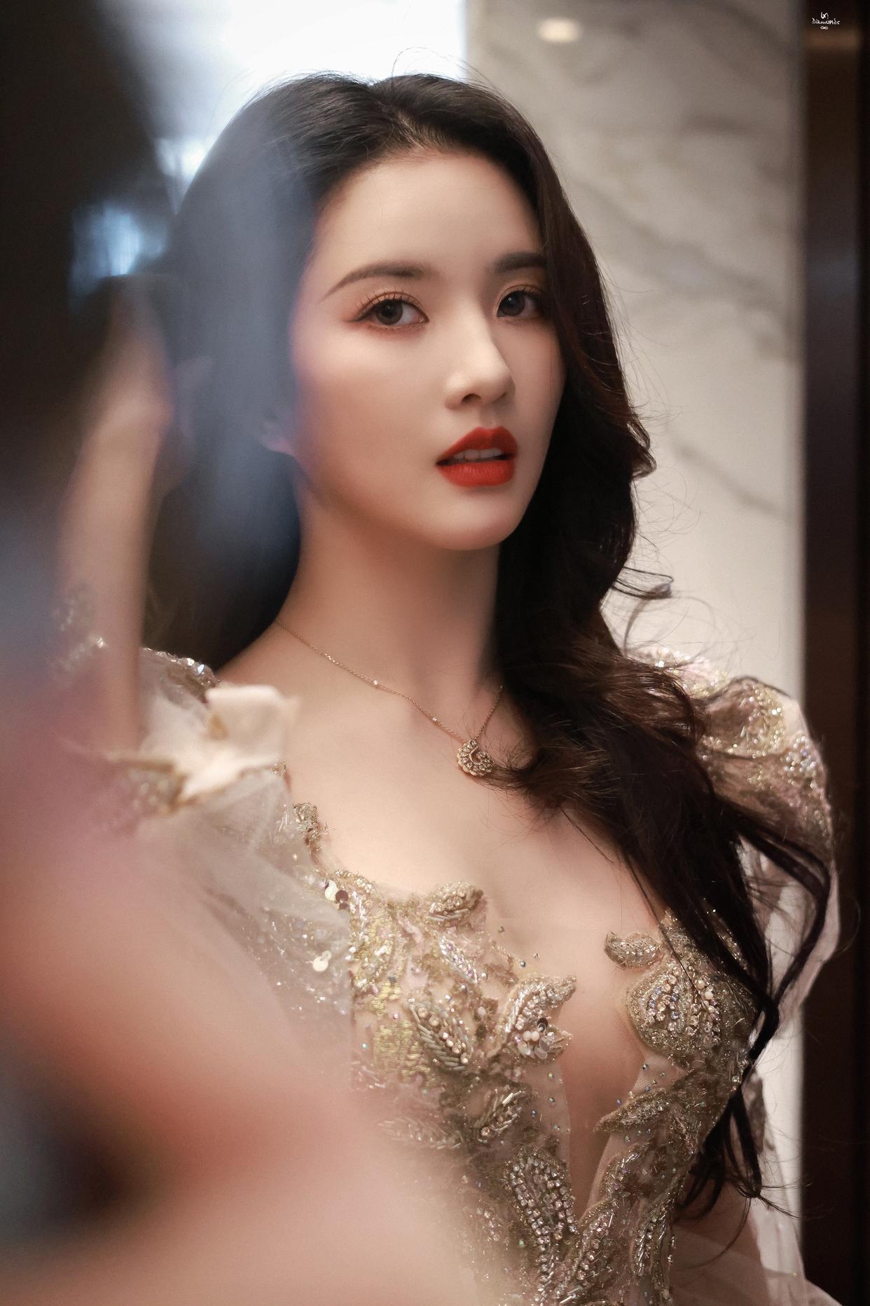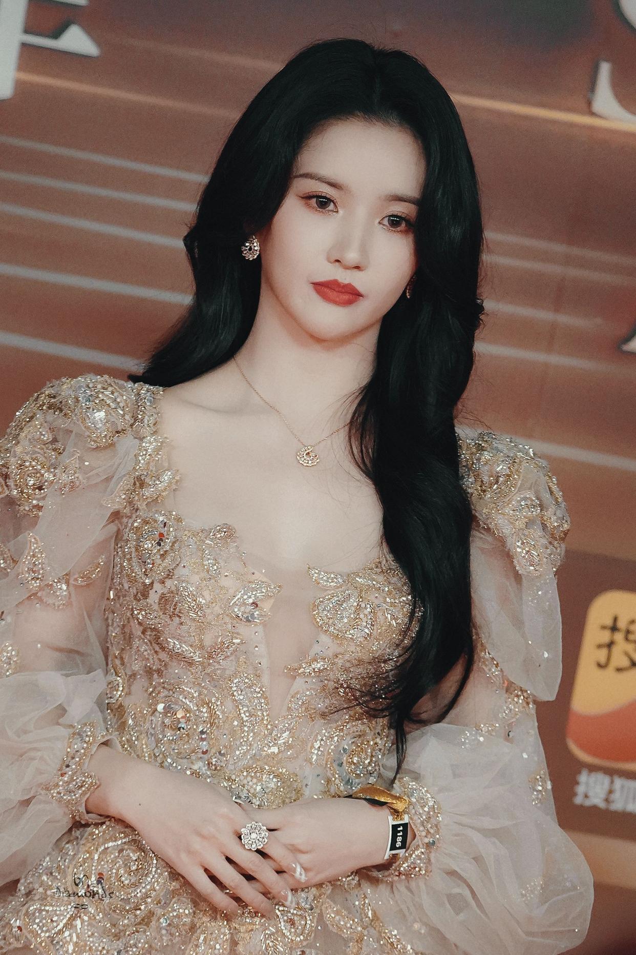 刘些宁金色礼服,薄纱轻盈,柔美典雅。