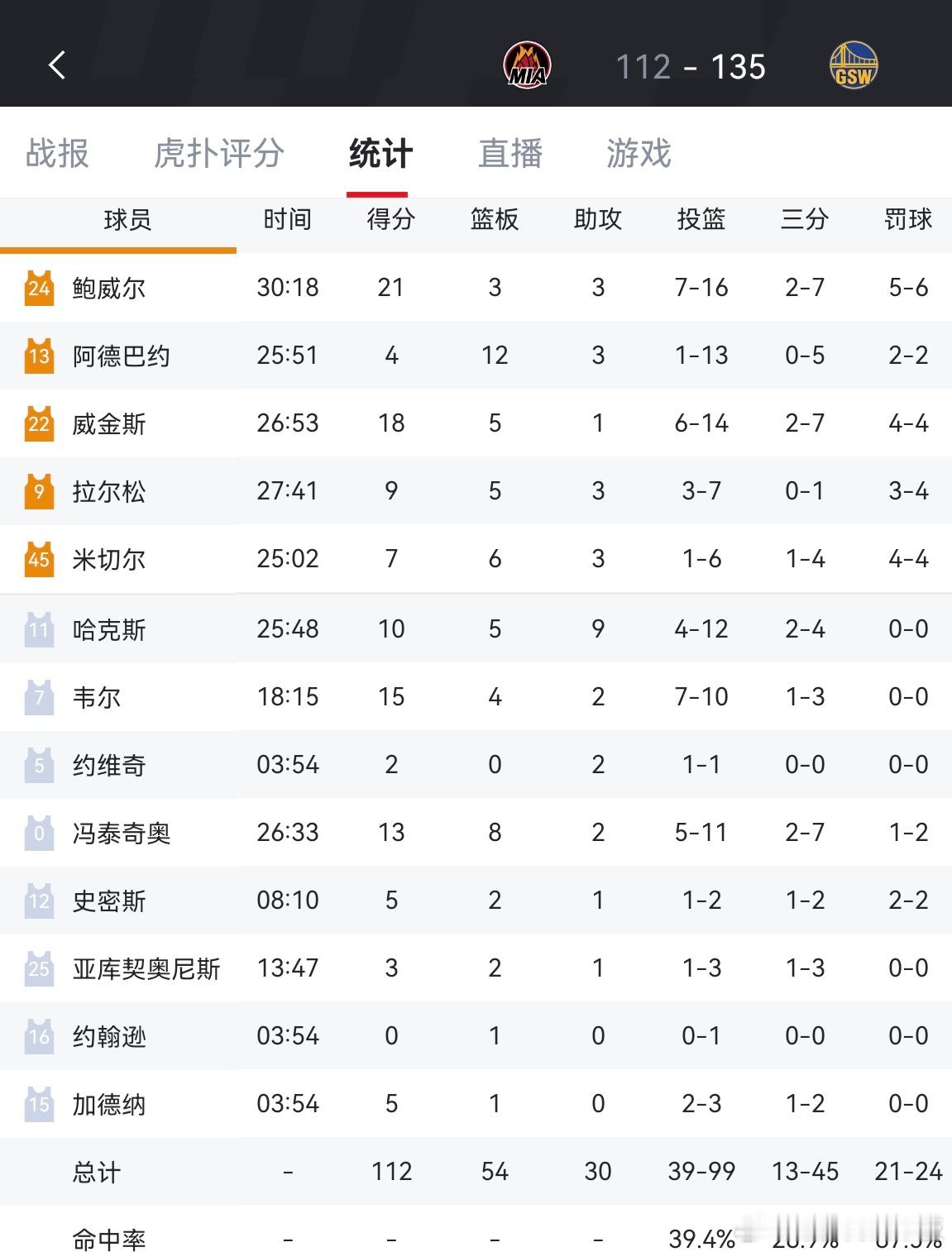 勇士135-112轻取热火,最近7场比赛赢下6场波杰姆斯基24分,库里19分,巴特勒伤退热火vs勇士 勇士四连胜