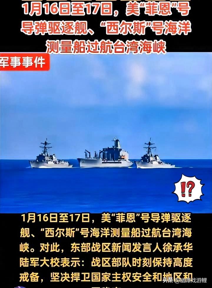 看着屏幕上一堆“理中客”的发言,我不厚道地笑了。 1月16、17号,两天时间,美国的“菲恩”号带着测绘船“西尔斯”号,大摇大摆穿过海峡。 竟然还有人洗地,说是“纯粹的科学考察”。 这种天真,简直比美国人的军舰还可怕。 人家那是在搞科研吗?那是在给潜艇找路,是在给那111亿的军火订单探风。 这把刀都架在脖子上了,还有人觉得那是用来切水果的。 现在的博弈,早不是请客吃饭,是实打实的生存挤压。 美国人至今没敢掀桌子,不是因为他们心善讲武德,纯粹是因为咱们现在的拳头够硬,硬到让他们不得不掂量掂量代价。 在这个只有利益没有道义的丛林世界里, 盲目相信对手的“善意”,就是把软肋递给人家捅。