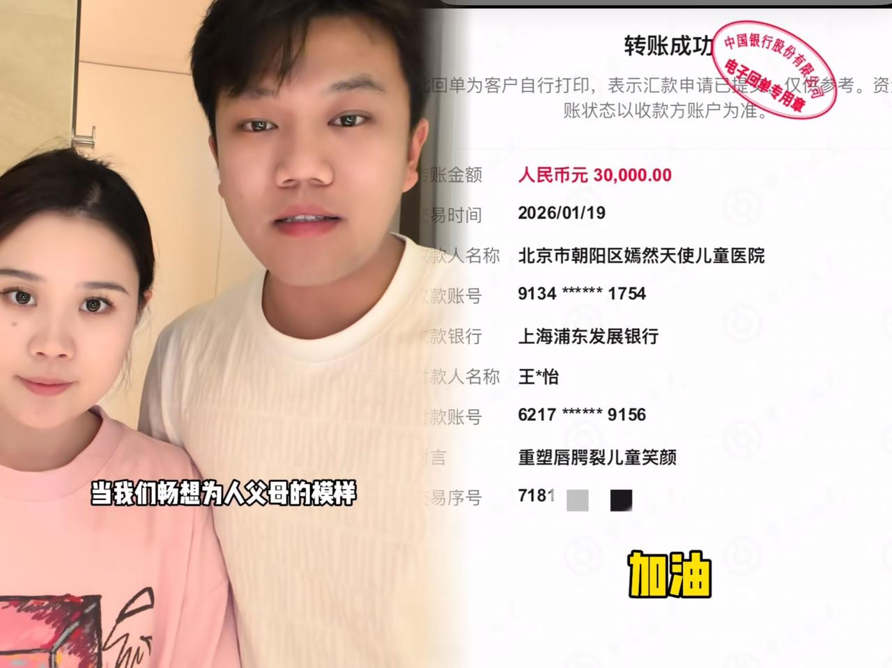 2026年元月19号这天, 解清帅和王正正 给北京嫣然天使儿童医院捐款啦, 还晒
