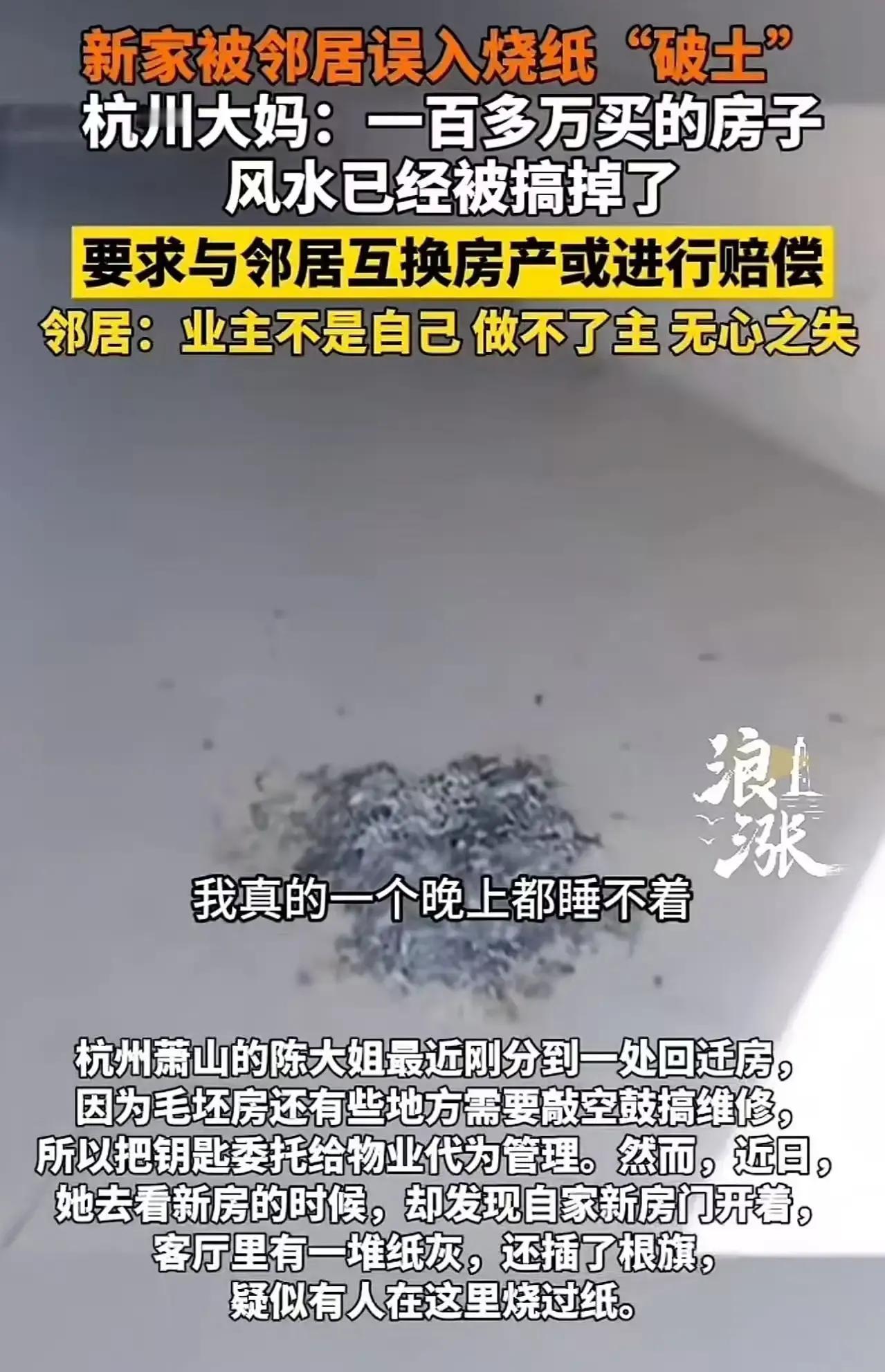 “太膈应人了!”浙江杭州一大妈收新房时,竟然发现屋内有一堆烧过的“元宝纸灰”!这究竟是怎么回事?难道新房里闹鬼了? 原来,这位大妈满心欢喜地去收新房,结果一打开房门,就被眼前的景象吓了一跳。屋里竟然有一堆烧过的“元宝纸灰”,这明显是有人故意为之啊!大妈毫不犹豫地选择了报案,警方经过调查,初步判断是隔壁邻居所为。大妈觉得邻居这种行为太过分了,不仅影响了新房的整洁,还让她心里留下了阴影,于是要求邻居赔偿几万。可邻居却一脸无辜地表示,自己只是走错了房间,没必要这样大动干戈。这说法显然难以让人信服,毕竟谁会无缘无故走错房间,还在里面烧“元宝”呢?这背后到底隐藏着什么秘密?是邻居的恶作剧,还是另有隐情?警方正在进一步调查中,相信很快就能真相大白。 这起事件真是让人哭笑不得,大妈收新房却遇到这种糟心事,换做是谁都会生气吧!你觉得邻居是故意为之还是真的走错了呢?快来评论区发表你的看法吧!废铁堆里藏凶案 烧金纸旺火 烧金留金元宝纸