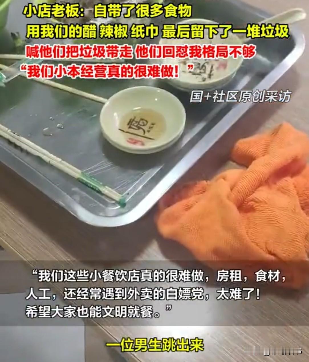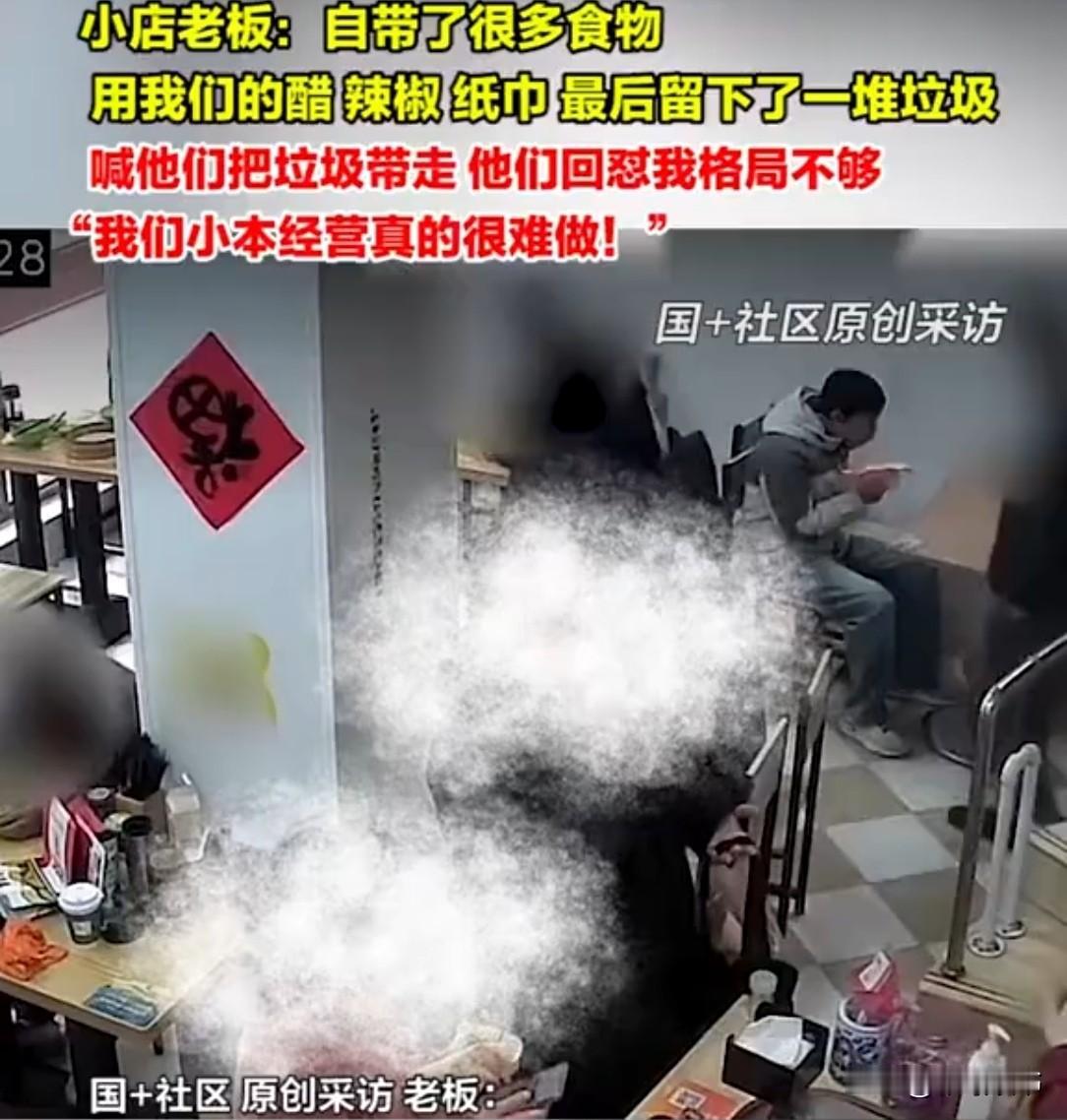 上海一小饭馆,6人自带食物来就餐,吃完拍拍屁股就走,桌上垃圾狼藉一片。老板上前拦住:“把垃圾带走!”谁知,对方却怒骂老板:“你这人格局也太小了!” 1月17日傍晚,上海老巷里的小饭馆刚上客,门帘“哗啦”被掀开,七个人簇拥着闯进来。老板老李眼睛一亮,搓着手迎上去:“几位里边请,想吃点啥?” 领头的壮汉摆摆手,嗓门洪亮:“不用菜单,来两碗紫菜蛋花汤就行。”老李心里咯噔一下,七个人就点两碗汤?失望掠过眼底,却还是笑着应下:“好嘞,马上来!” 几人找了张圆桌坐下,麻利地解开手里的塑料袋,酱鸭、卤味、凉拌菜摆了满满一桌,香气混着饭馆的烟火气散开。老李端汤过来时,瞥见他们顺手抽了店里大半包纸巾,还倒了小半瓶醋,他没作声——毕竟点了餐,也算店里的客人。 一个半小时后,其中一人提前离场,剩下六人抹了抹嘴,起身就往门口走。老李快步上前,指着桌上的狼藉:塑料袋、骨头、沾着油污的纸巾堆得老高,还有洒在桌上的菜汤,他眉头微皱:“几位,麻烦把垃圾带走一下。” 领头的壮汉停下脚步,转头瞪了老李一眼,语气带着怒气:“你这人格局也太小了吧?就这点垃圾,还要我们带?”同行几人也跟着附和:“就是,开店连这点包容心都没有?” 老李当场愣住,双手下意识攥紧了围裙。他心里犯嘀咕:他们自带食物占了桌位,用了店里的调料和纸巾,自己都没说一句,只是让他们带走自己留下的垃圾,这怎么就成了格局小?一时竟不知该如何反驳。 老话讲“与人方便,自己方便”。开店做生意图个和气,食客也得守规矩。自带吃食占座位、留垃圾还理直气壮,哪是格局的事儿,分明是不懂尊重。老板已经够体谅了,做人做事,互相迁就着来才好。