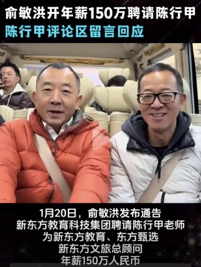 陈行甲加入新东方,俞敏洪加入恒晖公益,新东方、恒晖公益实现双向奔赴 陈行甲以“我加入新东方,他加入恒晖”简洁回应了俞敏洪的150万年薪邀请,并在社交媒体留言“一早收到俞老师发过来这个信息”,确认接受新东方总顾问职位。 1月20日,新东方官宣聘请陈行甲担任教育、东方甄选、文旅三大板块总顾问,年薪150万元;同时俞敏洪加入陈行甲的恒晖公益基金会,新东方承诺每年捐赠至少100万元。 这场"双向奔赴"的跨界合作引发热议,此前陈行甲因在基金会年薪超70万元曾受舆论质疑。