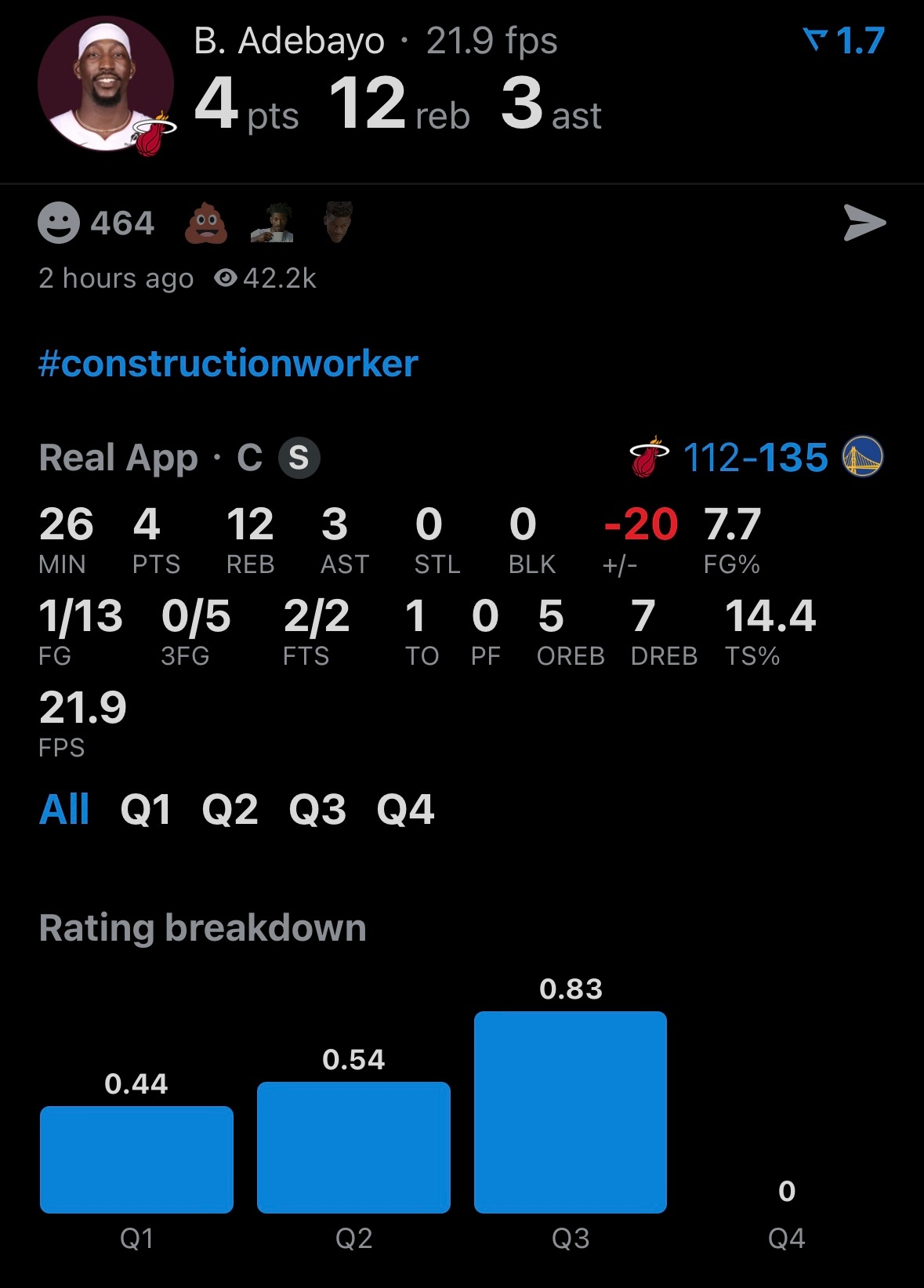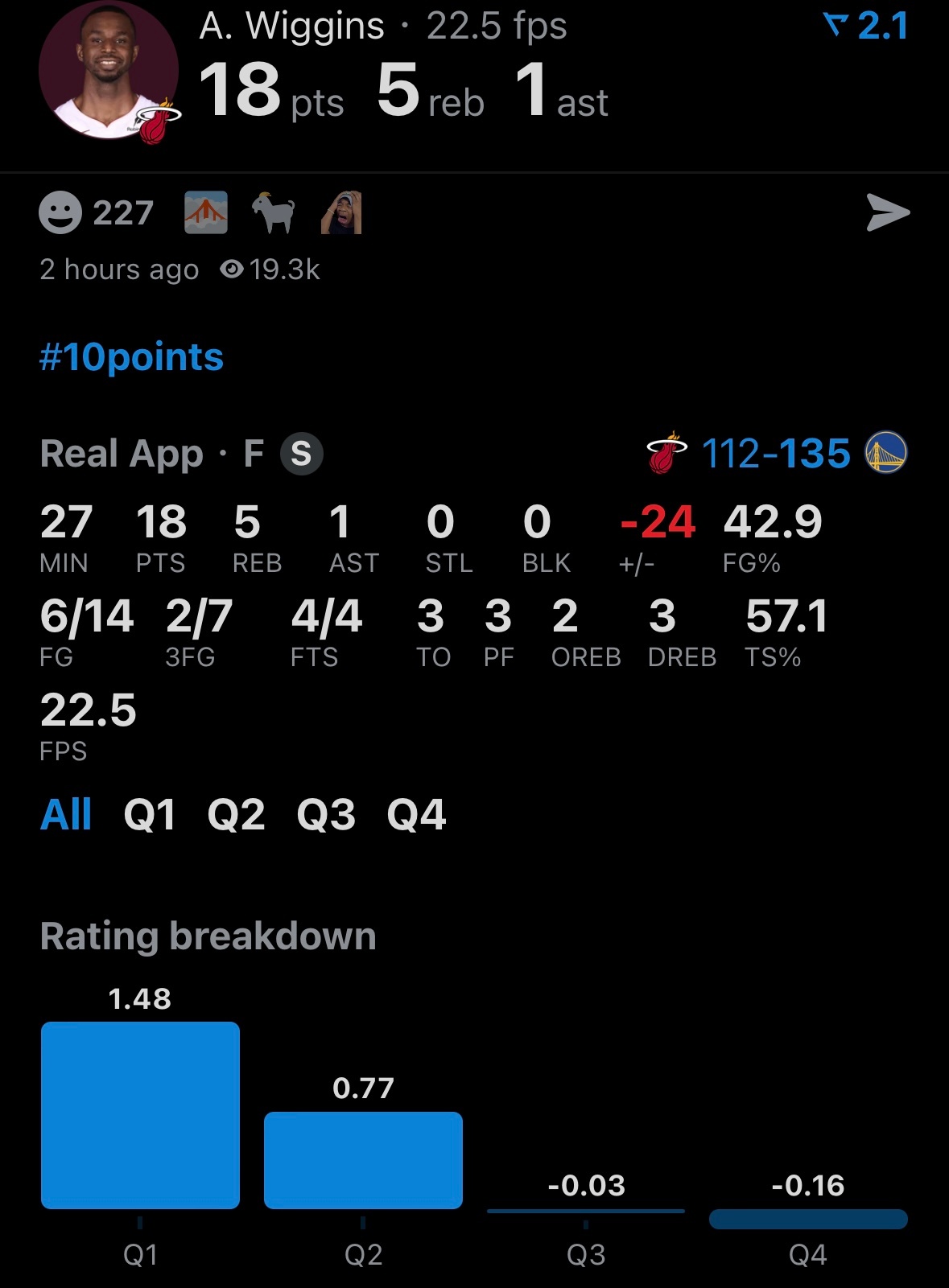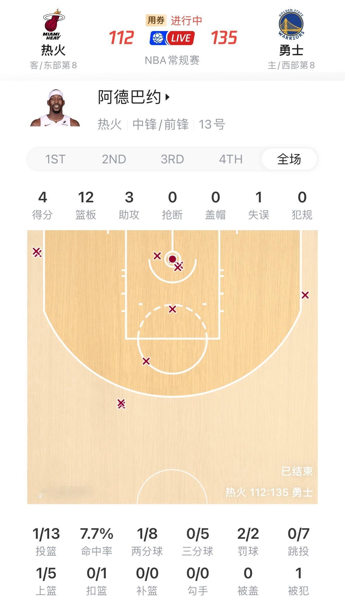 阿德巴约13投1中,4分12板,正负值-20。维金斯半场18分,全场18分,正负值-24。热火vs勇士