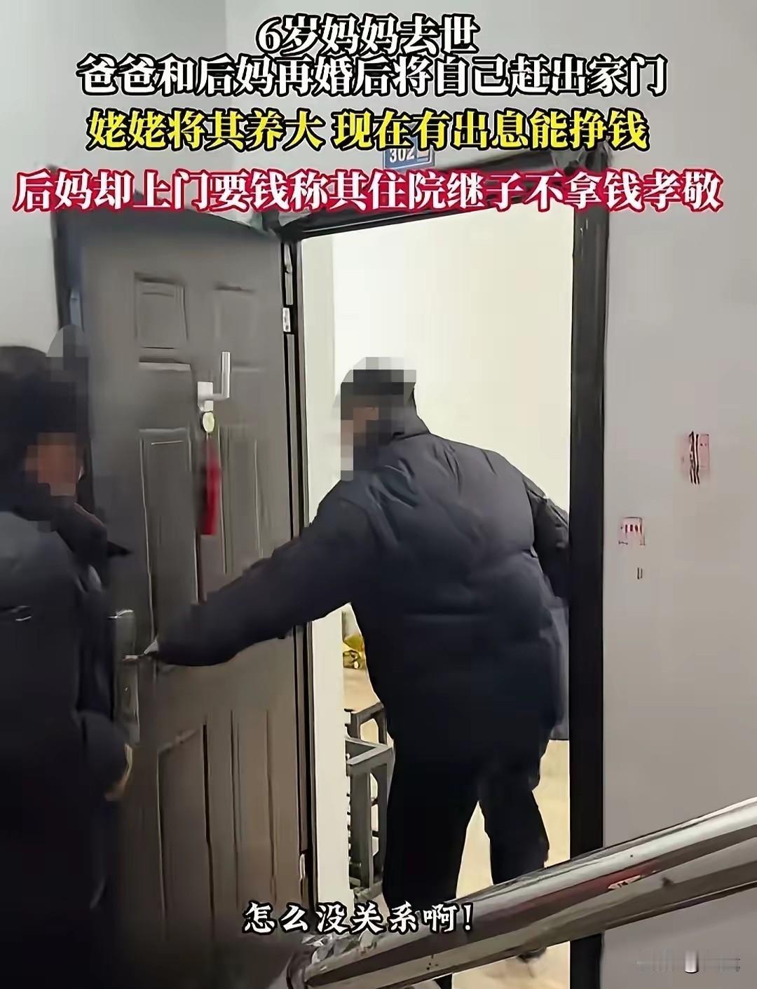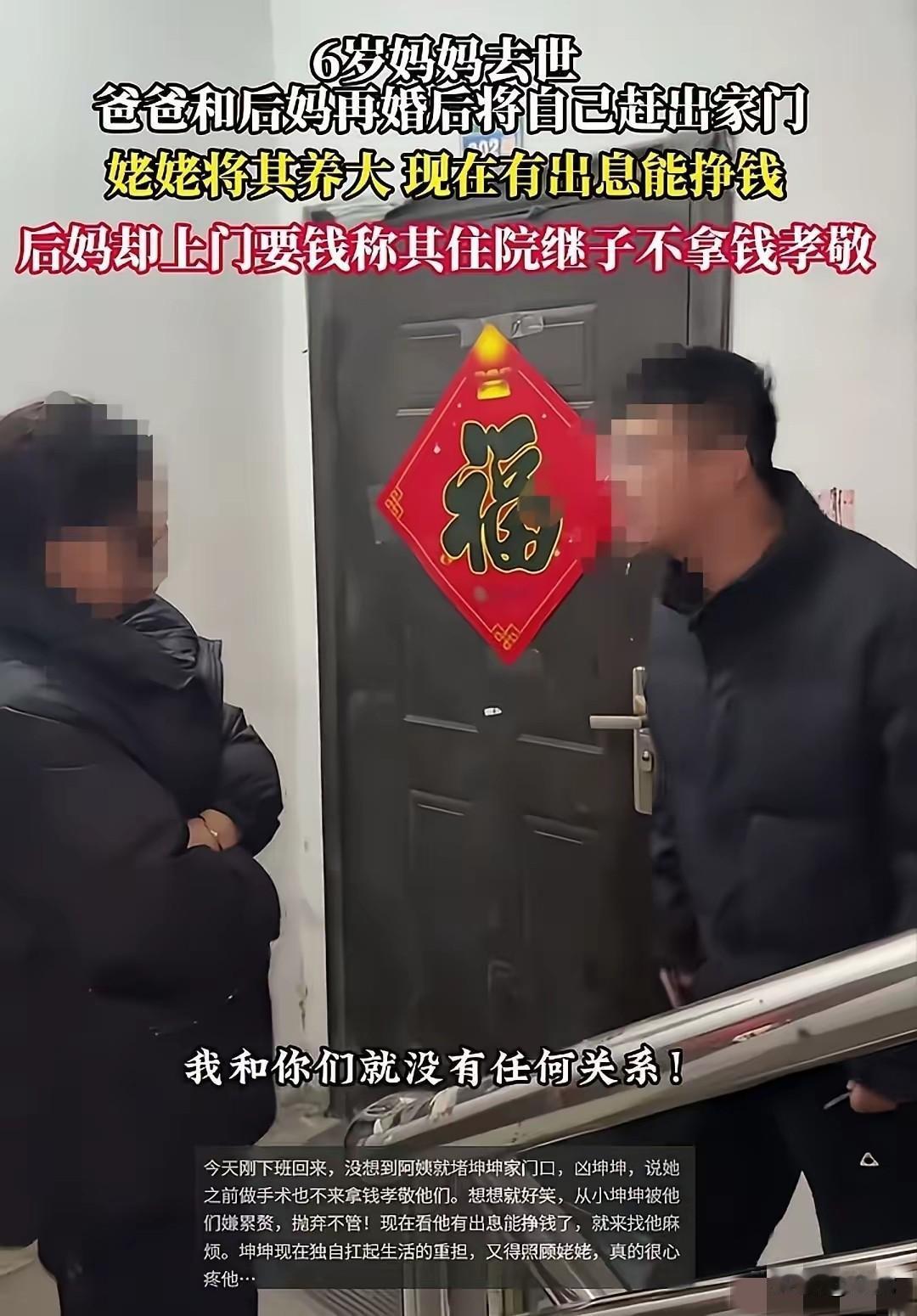 00后男子被继母堵在门口索要赡养费,一句“一分不给!”道尽二十年的辛酸。6岁丧母的他,很快被再婚的父亲和继母视为累赘抛弃,由姥姥艰难抚养长大。如今事业有成的他,不仅要独自承担生活重担,还需照顾年迈的姥姥。 继母以“不孝顺”为由指责他,却忘了自己当年对这个“累赘”的冷漠。男子愤怒控诉:“从你们抛弃我的那刻起,我们毫无关系!”他的决绝源于被遗弃的创伤,在他最需要关爱时遭弃,却在对方需要时被要求尽孝,这种“亲情”来得太迟。 若继母当年能给予点滴温暖,孩子定会感恩;如今却想空手套孝心,实在荒谬。亲情非血缘的独奏,而是付出的和弦。