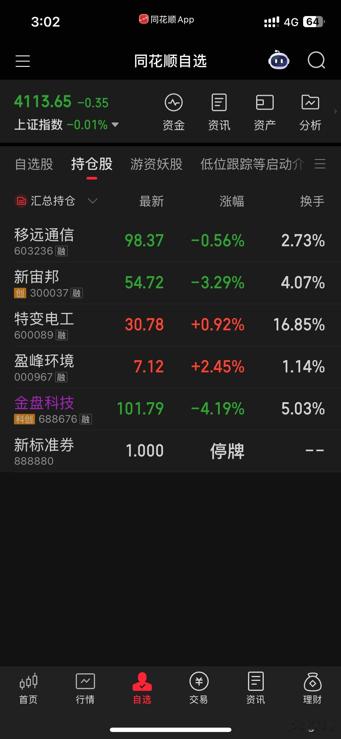 下午电网有一波反弹,特变也趁势强势反弹,尾盘再次跟随板块回落,我没有掌握好节奏做好高抛低吸。金盘今天较弱,电网反弹期间股价反弹无力,尾盘掉落更快[捂脸]。下午抛了点特变剩下500股,止盈了2千股盈峰,还剩6千股。400股金盘没动。移远和新宙邦没有理它。收盘亏1千2百多,相比上午亏损缩小一半。
