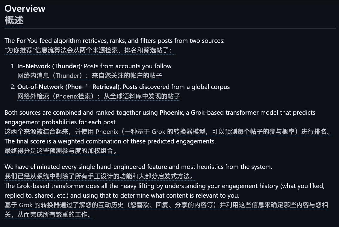 马斯克前几天承诺公开的X新版推荐算法公开了:github.com/xai-org/x-algorithm“ 为你推荐信息流算法从两个来源获取、排序和筛选帖子:网络内(Thunder):来自你关注账号的帖子 网络外(Phoenix Retrieval):从全球内容库中发现的帖子 这两个来源的内容会被合并,并通过Phoenix——一种基于Grok的Transformer模型——进行统一排序。该模型会预测每条帖子的互动概率,最终得分是这些预测互动的加权组合。我们已从系统中彻底移除了所有人工设计的特征和大多数启发式规则。基于Grok的Transformer模型承担了全部核心工作,通过理解你的互动历史(例如你点赞、回复、分享等内容),判断哪些内容对你而言更相关。”科技先锋官
