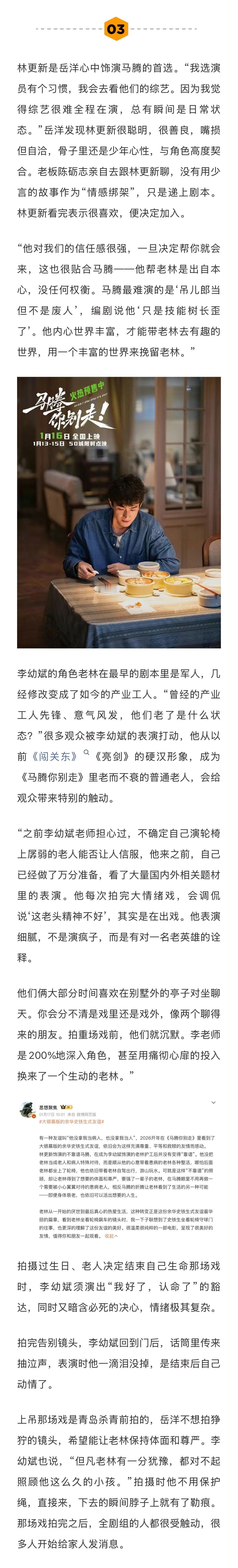 一部编剧遗作的诞生幕后马腾导演看综艺选中林更新 林更新是导演岳洋心中饰演马腾的首选。看综艺过程中,岳洋发现林更新很聪明,很善良,嘴损但自洽,骨子里还是少年心性,与角色高度契合。老板陈砺志亲自去跟林更新聊,没有用少言的故事作为“情感绑架”,只是递上剧本。林更新看完表示很喜欢,便决定加入。“他对我们的信任感很强,一旦决定帮你就会来,这也很贴合马腾…”娱理独家↓