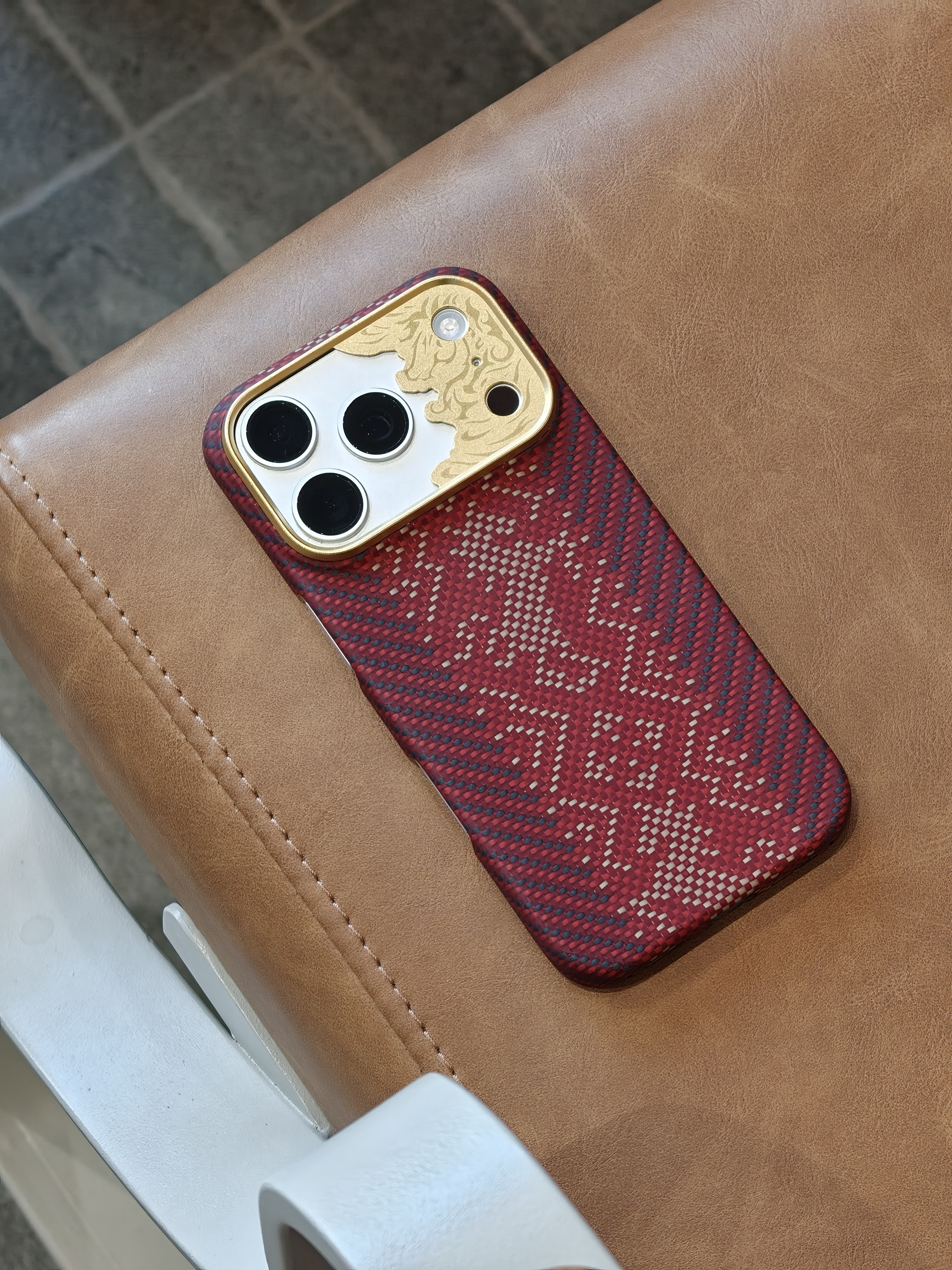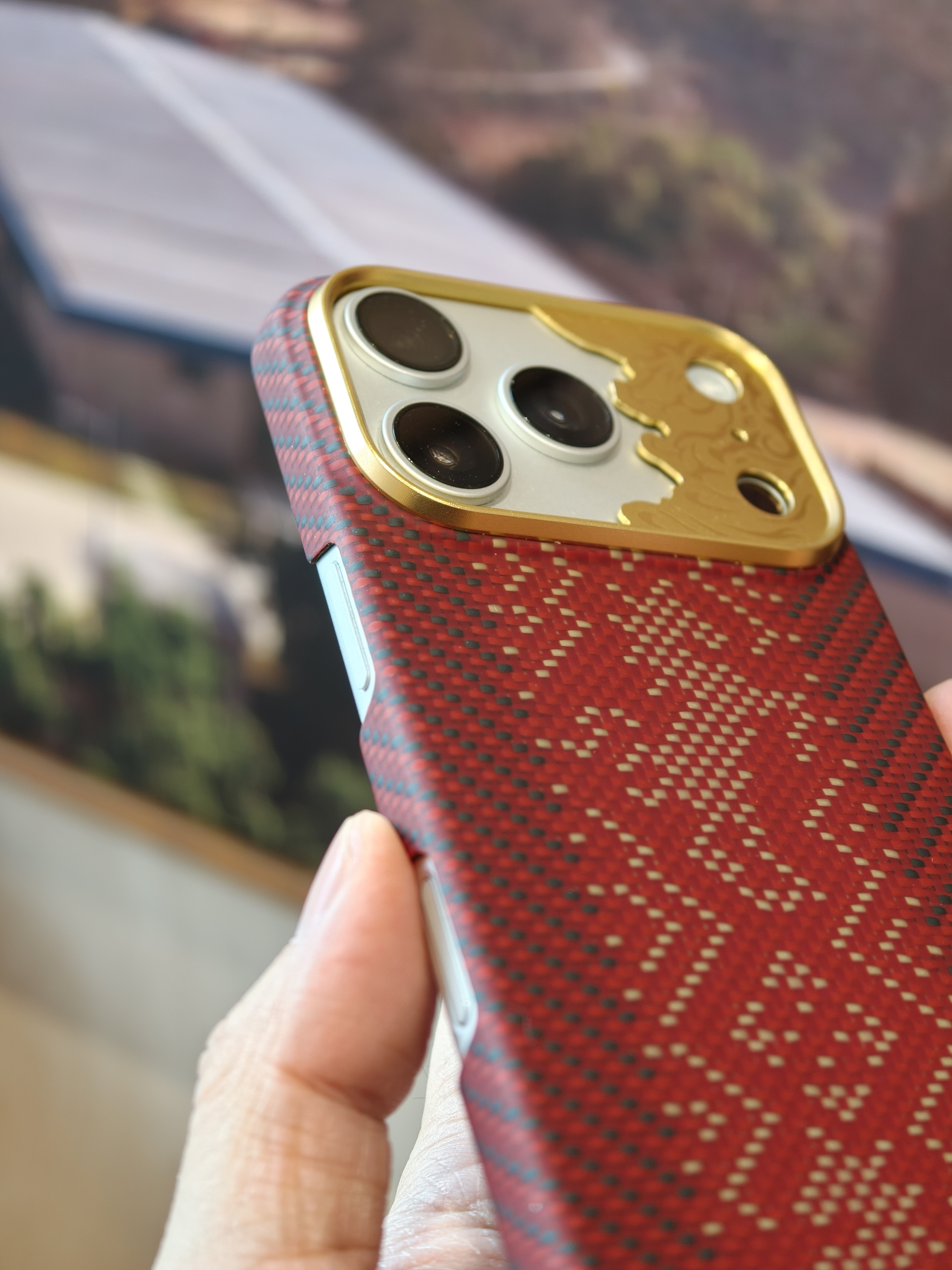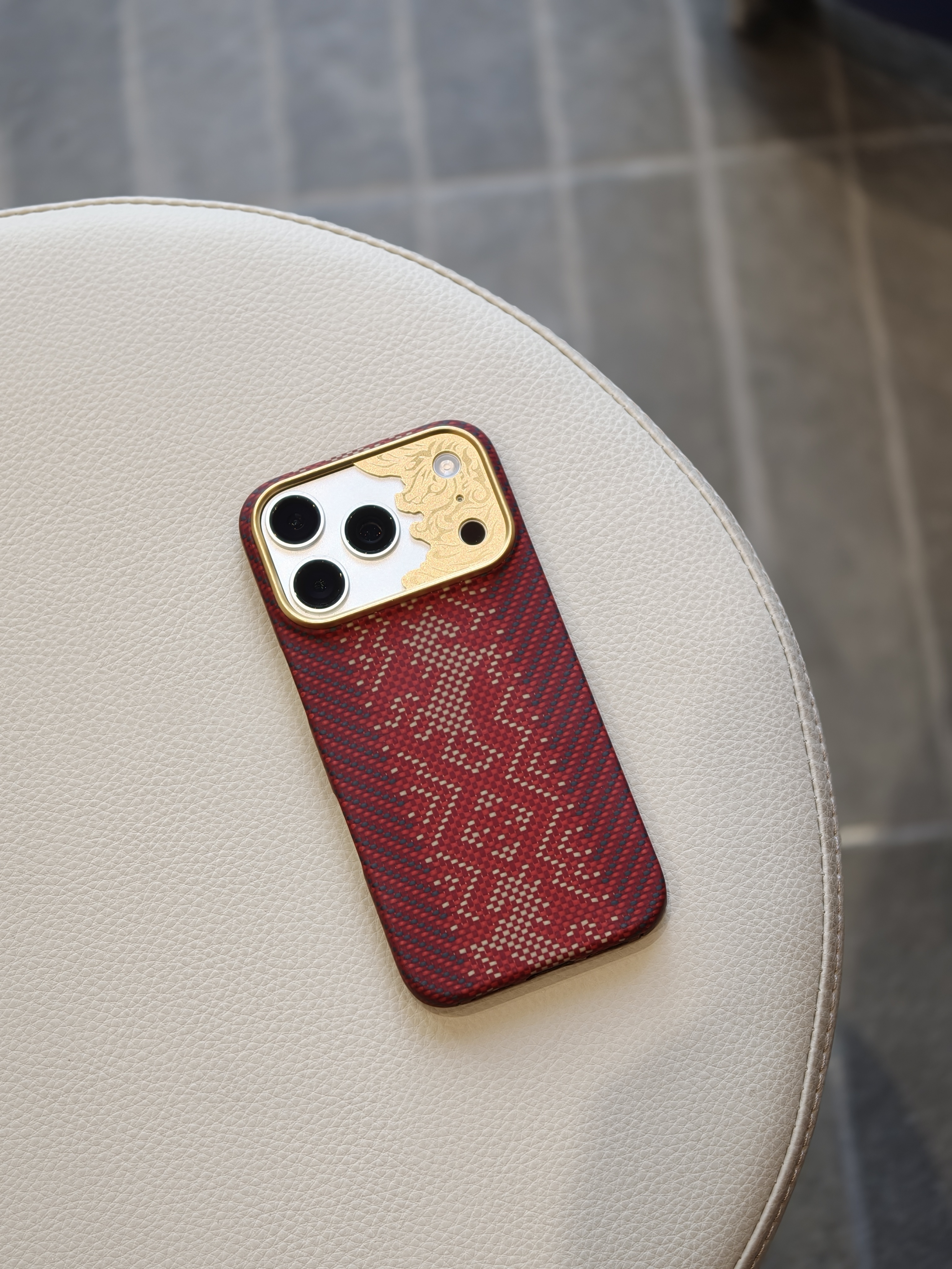 今天 iPhone 17 Pro 的新衣服是邦克仕Benks家的 马年限定『赤骥承金』保护壳。整体很有节日氛围,采用凯夫拉编织而成,经纬线间就是马的形象,蛮应景的,镜头圈很有特点,是一块金属的精雕马的图案,灯光下还一闪一闪的,挺特别的。有一说一,Benks这几年凯夫拉配件的质量跟审美都上来了啊,老牌配件厂还是有底蕴在的。