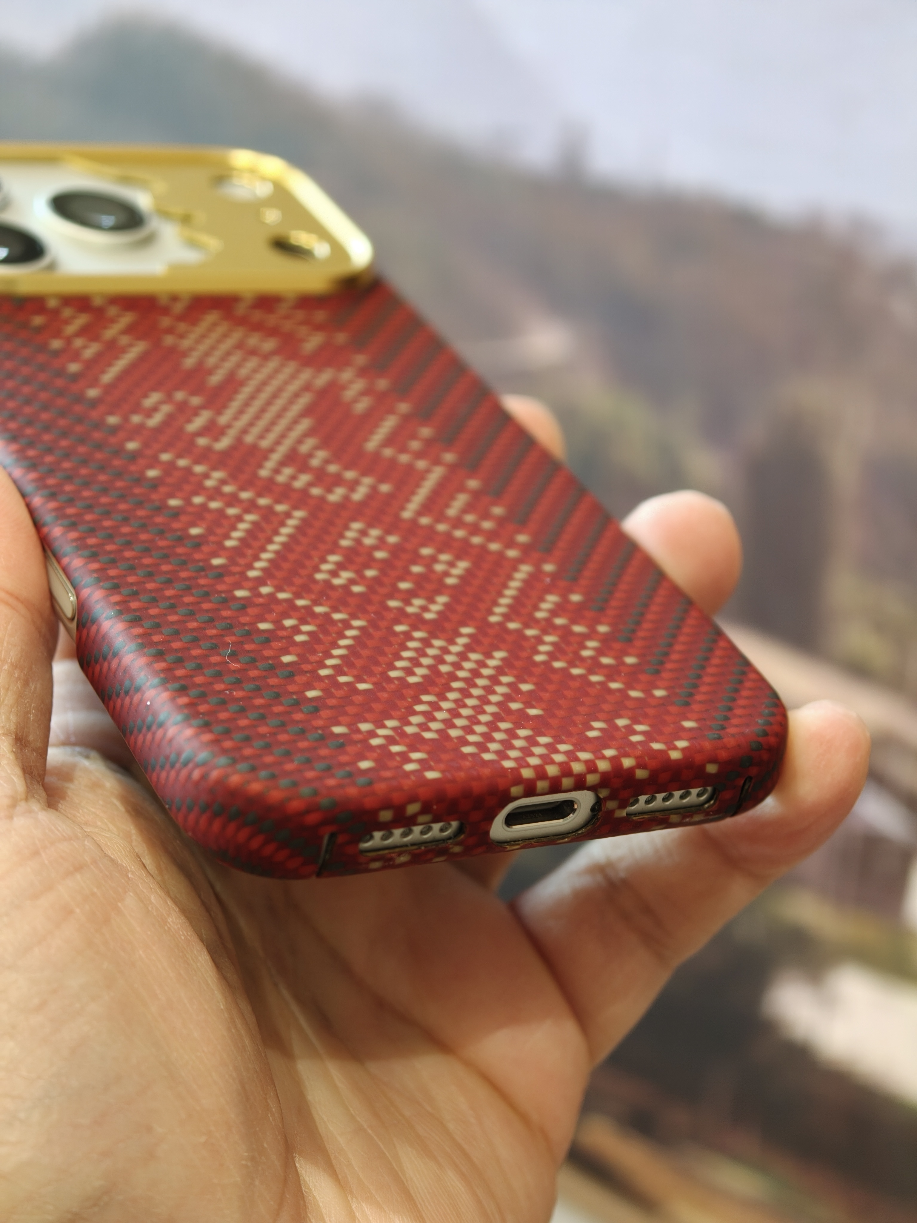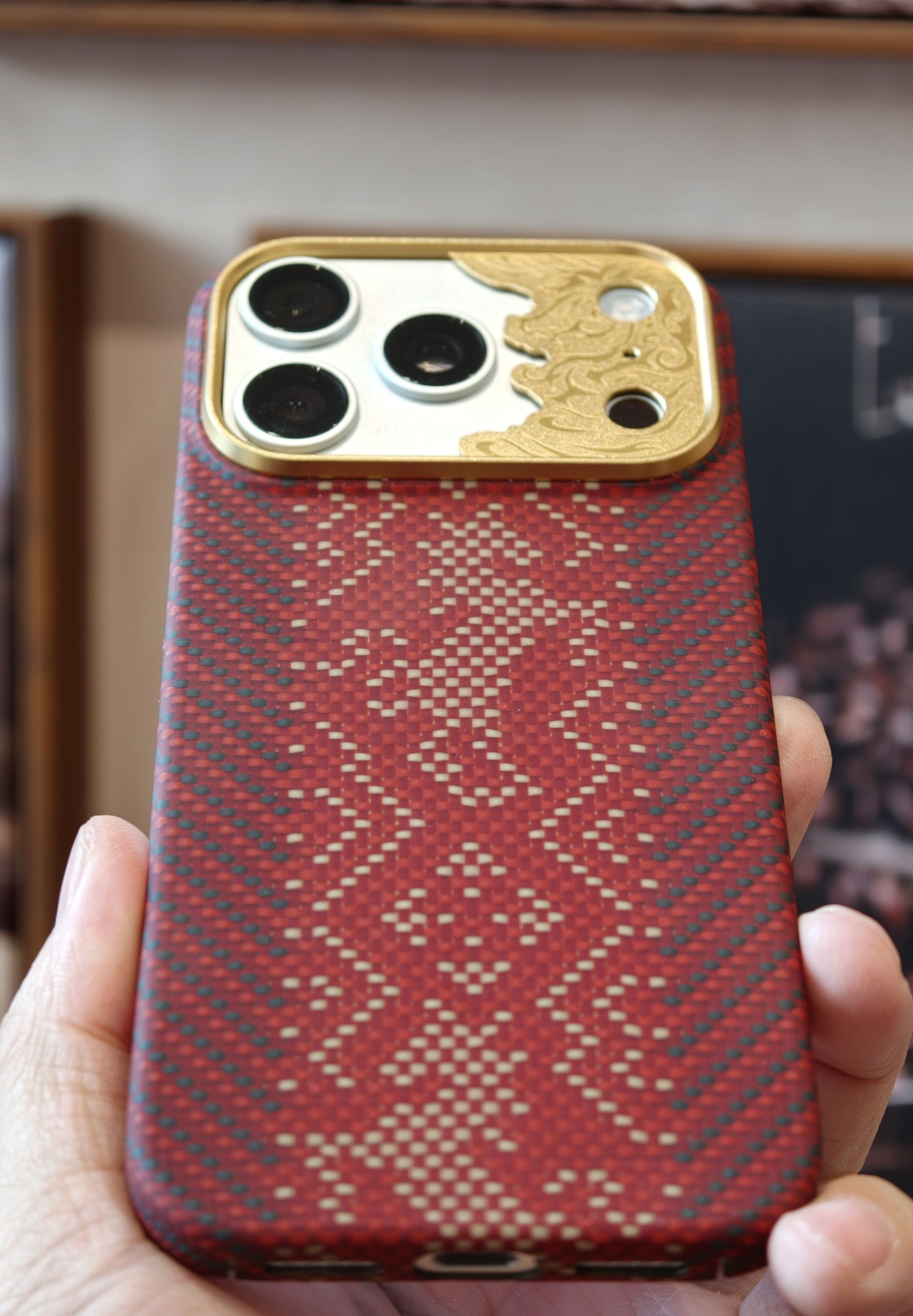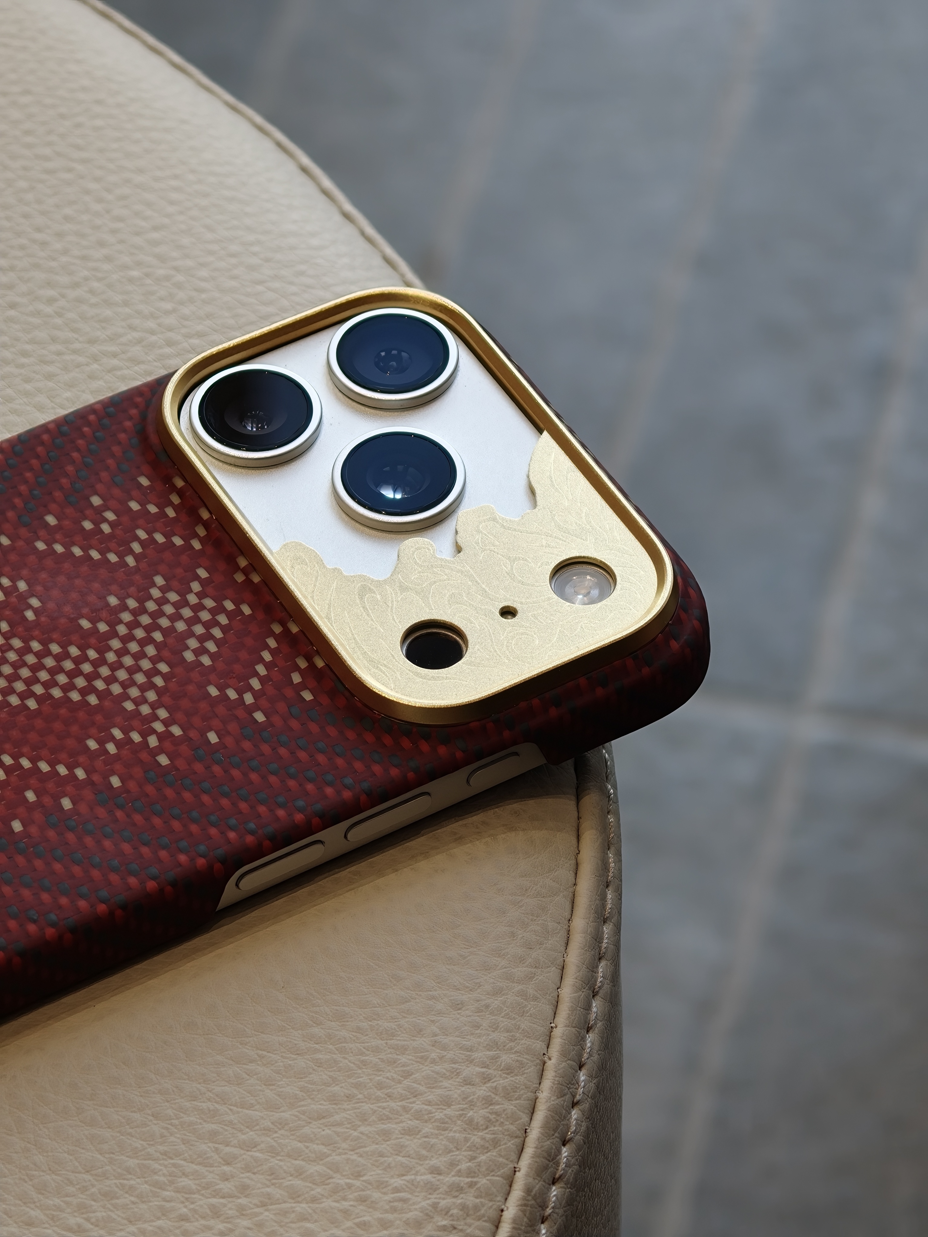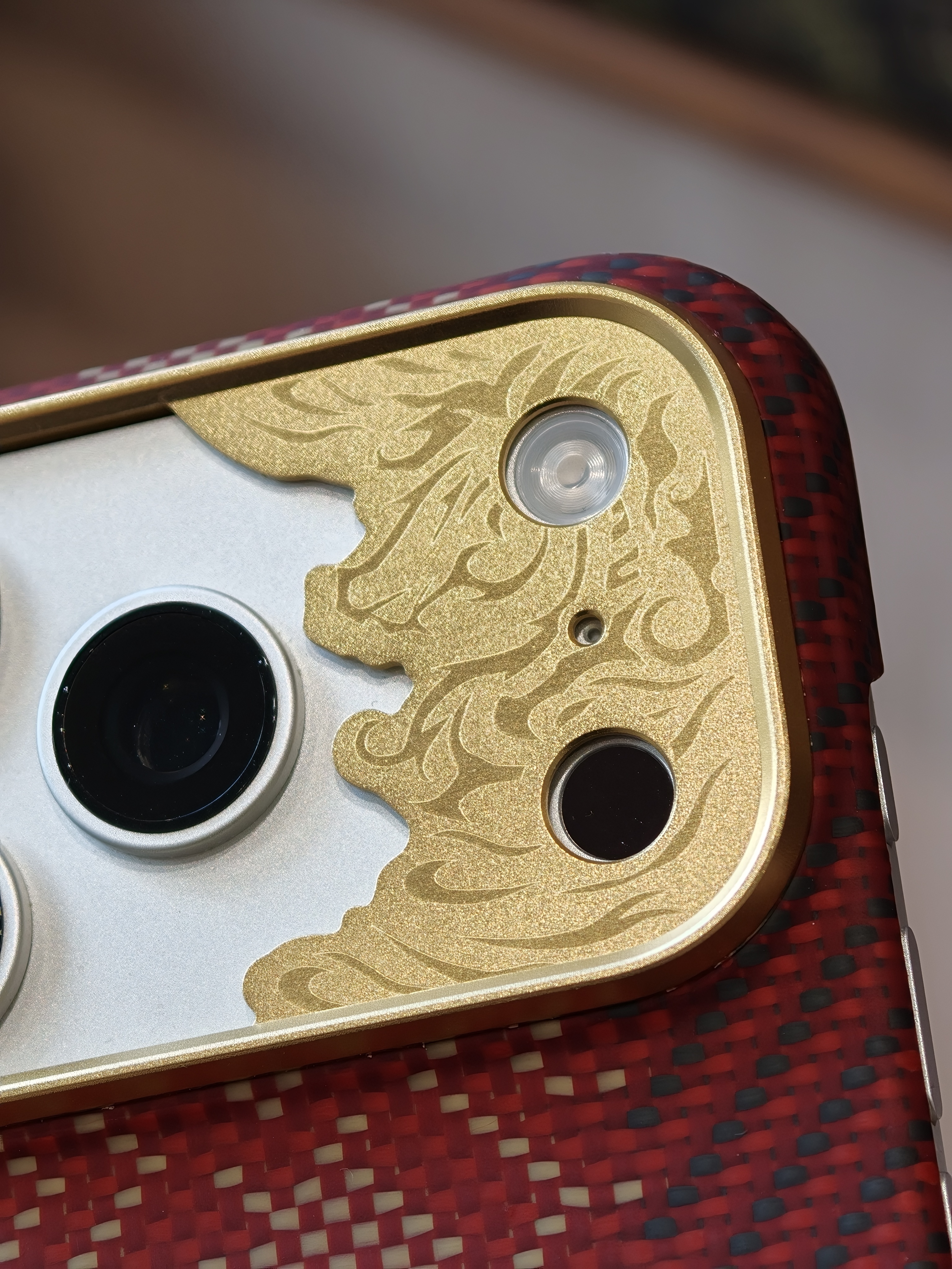 今天 iPhone 17 Pro 的新衣服是邦克仕Benks家的 马年限定『赤骥承金』保护壳。整体很有节日氛围,采用凯夫拉编织而成,经纬线间就是马的形象,蛮应景的,镜头圈很有特点,是一块金属的精雕马的图案,灯光下还一闪一闪的,挺特别的。有一说一,Benks这几年凯夫拉配件的质量跟审美都上来了啊,老牌配件厂还是有底蕴在的。
