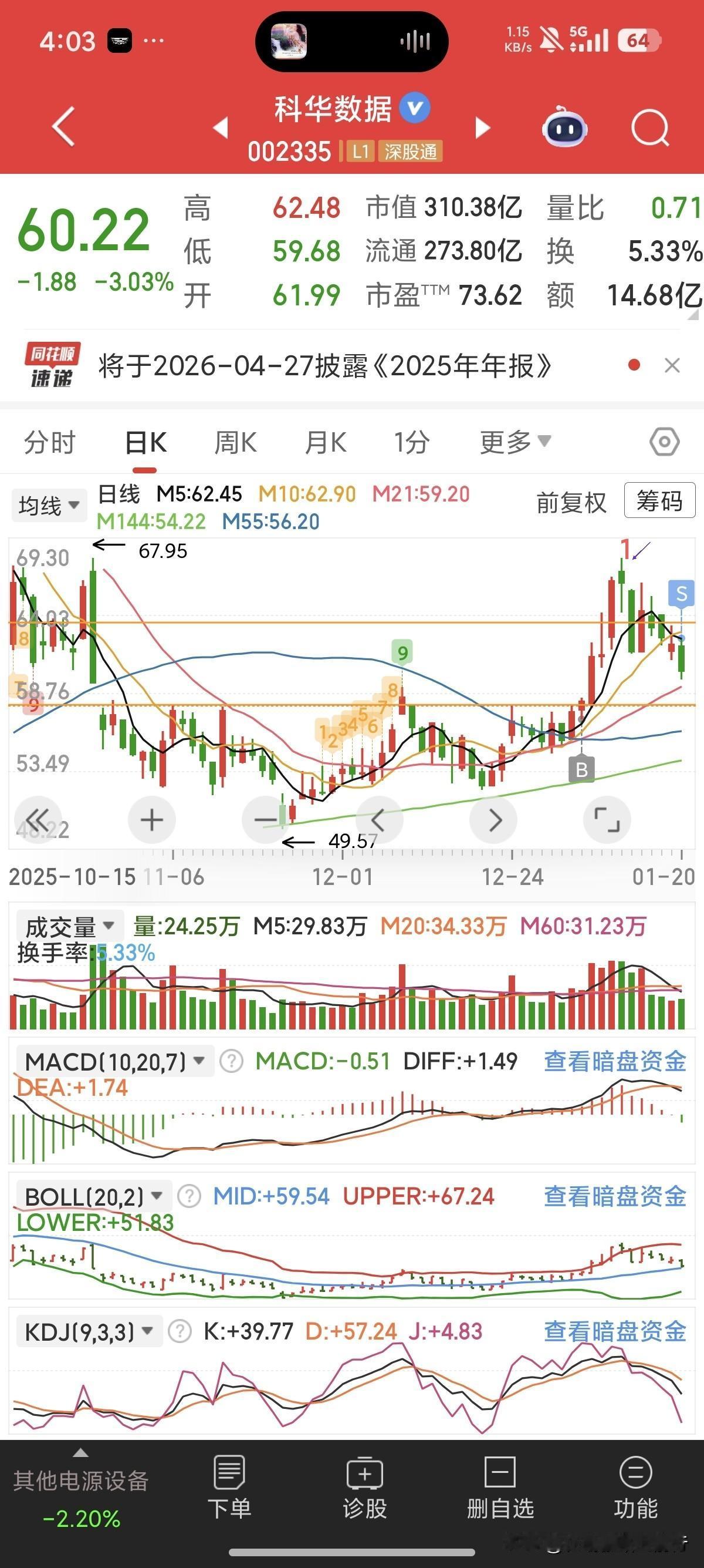 十万想变百万。市场上已经没有股神了。 说说今天的操作,你们是不是也这样?看图二,科华数据。买点,过左峰且量价温和上涨,卖点应该是什么呢?左边的大峰。箭头指的1就是卖点。为什么没卖?因为贪,觉得能一下过去,强势行情也得调整三天,别说这种垃圾行情了。那现在为什么又卖了?扛不住了,保住利润。其实现在已经接近买点了,需要阳包阴。