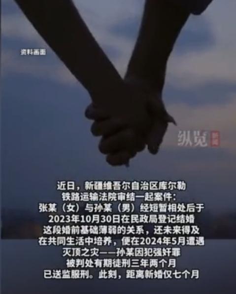 新疆,一女子跟一男子闪婚,可结婚7个月,还没来得及培养感情,男子竟然犯强奸罪,被判处有期徒刑3年2个月,女子崩溃,自己真是有眼无珠,这是嫁了个什么东西?万万没想到,男子竟然厚着脸皮请求女子给他一个机会,女子大怒:做你的春秋大梦去吧,我要离婚! 张女士经人介绍,认识了孙某,也不知道两人是一见钟情,还是他们都老大不小的了,就直接忽略了相互了解的过程,在认识没多久就喜结良缘了。 这样的婚姻,完全就是头脑发热,没感情基础,很容易出问题,也不知道张女士咋想的,完全是飞蛾扑火。 可能张女士恨嫁,觉得遇到一个看着顺眼的男人,就别磨叽了,结了婚再培养感情也来得及,可她万万没想到,自己所嫁非人,结婚才7个月,就出了大问题。 张女士2023年10月30日登记结婚,孙某2024年5月就锒铛入狱了,而他们结婚才仅仅7个月。 而孙某被判刑3年2个月的罪名,让张女士既无法接受,也感到颜面扫地。 原来,孙某犯的是强奸罪,这个罪名简直是道德败坏,有辱家门。 如果孙某一时冲动打架斗殴,或者意气用事故意伤害,任何一种罪名,张女士都没觉得这么丢人。 孙某家有贤妻,而且张女士长的也很漂亮,能拿得出手,他却犯下这么不可原谅的错误,这种羞辱,让张女士无法释怀,自己父母都跟着她丢人现眼。 愤怒的张女士,一纸诉状起诉离婚,她要跟这个男人一刀两断划清界限,当初自己怎么就瞎了眼,嫁给了他? 张女士后悔自己的闪婚,对这个男人的品行一点都不了解,就把终身托付了,到头来真是追悔莫及。 不料,正在服刑的孙某并不愿意离婚,他通过视频连线,跟张女士忏悔,说他知道错了,让张女士原谅他,给他一次机会。 但在张女士看来,孙某的罪行,已经触碰到她的底线了,这样的人,不值得原谅,她坚持要求离婚。 虽然结婚才7个月,她就婚姻破裂了,但她选择宁缺毋滥。 闪婚遇“渣男”,离婚是及时止损的明智之举 张女士这闪婚闪离的事儿,真是让人又气又叹。 气的是那孙某,家里有漂亮贤妻还不知足,竟干出这种道德败坏、违法犯罪的勾当,把好好的一个家搅得支离破碎。 叹的是张女士,本想着赶紧结婚培养感情,结果所托非人,短短7个月婚姻就走到尽头,还遭受了这么大的羞辱和伤害。 如今闪婚好像成了一种趋势,有些人觉得年龄大了,遇到个看着顺眼的就赶紧把婚结了,感情可以婚后慢慢培养。 可婚姻哪是这么简单的事儿啊!感情基础那可是婚姻的基石,没有它,婚姻就像建在沙滩上的房子,稍微有点风吹草动就摇摇欲坠。 张女士就是吃了这闪婚的亏,对孙某的品行一点都不了解,就稀里糊涂地把终身大事给定了,结果落得个追悔莫及的下场。 孙某犯下罪,这可不是一般的错误,这是触碰了法律和道德的双重底线啊! 这种行为不仅给受害者带来了巨大的身心伤害,也让自己的家庭陷入了无尽的痛苦和耻辱之中。 他还好意思请求张女士给他一个机会,也不想想自己干的事儿有多恶劣。 婚姻是建立在相互尊重、信任和忠诚的基础上的,他这么一犯事儿,这些基础全都没了,还怎么让张女士原谅他、继续跟他过日子呢? 张女士坚决要求离婚,这是再正确不过的选择了。 她没有被孙某的忏悔所迷惑,也没有因为婚姻时间短就勉强自己将就下去。 她清楚地知道,这样的男人不值得她再付出感情和时间,宁缺毋滥才是对自己负责的态度。 在婚姻里,如果一方犯了不可原谅的错误,另一方选择离开,不是无情,而是对自己的保护,是为了避免受到更多的伤害。 这起事件也给那些打算闪婚的人敲响了警钟。婚姻不是儿戏,不能因为一时的冲动或者外界的压力就匆匆做出决定。 在结婚之前,一定要多了解对方,看看对方的品行、价值观是否和自己相符,看看彼此是否真的适合走进婚姻的殿堂。 只有建立在深厚感情基础上的婚姻,才能经得起生活的考验,才能长久地幸福下去。希望张女士能早日走出这段阴影,重新找到属于自己的幸福。 根据《民法典》第1079条第3款第五项规定,其他导致夫妻感情破裂的情形,法院应当准予离婚。 本案中,张女士与孙某闪婚,本就缺乏感情基础,婚后7个月孙某便因强奸罪获刑3年2个月,其行为严重违反道德与法律,直接摧毁了夫妻间的信任与忠诚基础,属于导致夫妻感情破裂的重大过错情形。 孙某的犯罪行为不仅让张女士承受了巨大的精神羞辱,也使得双方婚姻存续的意义完全丧失,符合民法典中“其他导致夫妻感情破裂”的认定标准。 因此法院判决准予离婚是合理合法的,这也是对无过错方张女士合法权益的保护。 最终,法院判决张女士和孙某离婚。 关注@灋律盐究员 学法辩是非,用法止纷争。