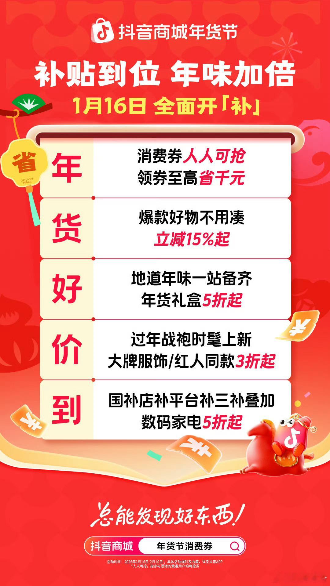 抖音商城年货节好价开卖 抖音商城搜【年货节消费券】领券每到过年,精品年货少不了。快来抖音商城年货节逛逛,年货礼盒5折起,大牌服饰3折起,数码家电5折起。这么多好货,得好好捋一捋,一年里就年底这次最豪横了,怎样买最划算,能将年终奖利用到最大,买回来的东西最多。抖音年货节消费券先囤起来。