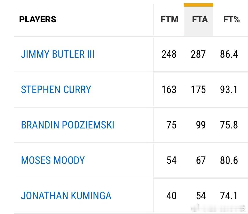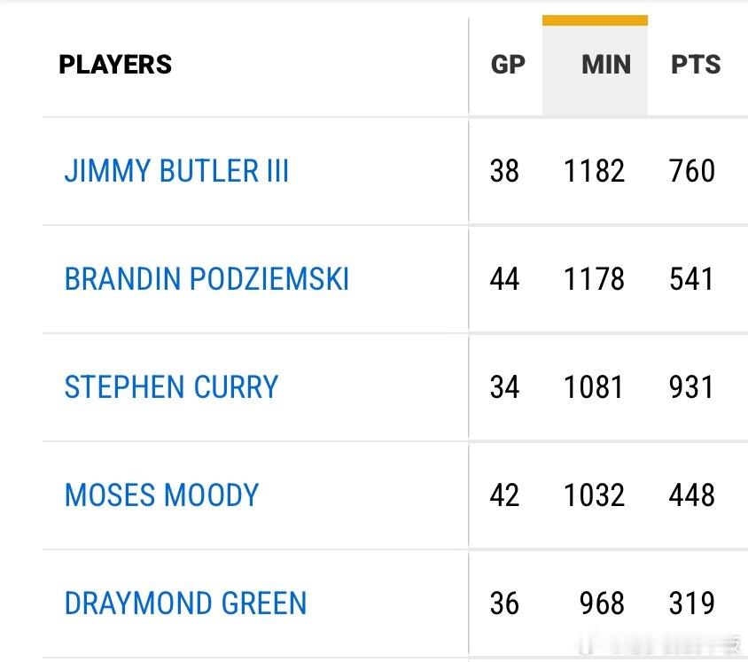 巴特勒本赛季多项数据领跑勇士全队⬇️-总出场时间1182分钟;-抢到88个进攻篮板球,断档领先队内第2的小佩顿(46个);-获得287次罚球,命中248个,两项数据均为队内第1巴特勒赛季报销