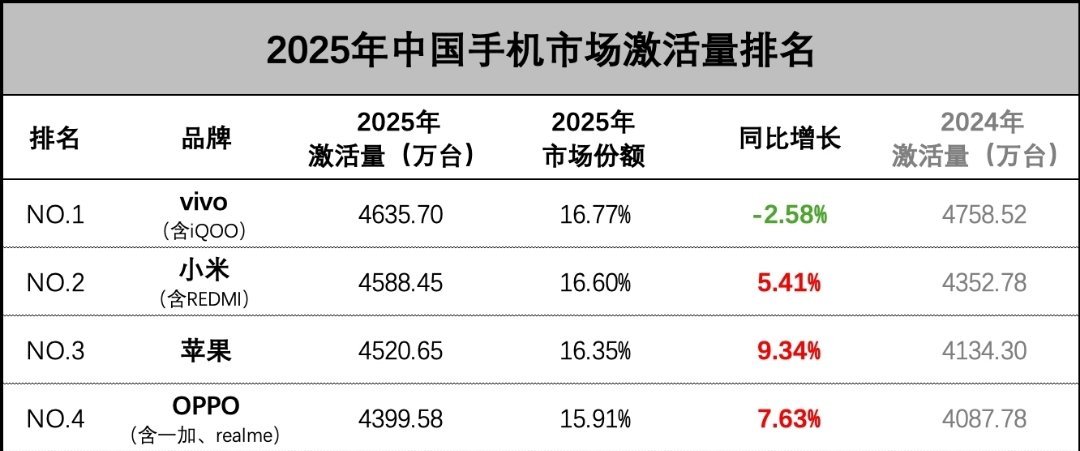 小米25年国内市场表现有点超预期了,整体产品线在做高端化结构调整,小米数字系列由两款变为三款,REDMI K系列出了Pro Max,两个系列均价提升都很大。甚至小米数字系列里面,Pro Max能占一小半。所以去年理论上是份额上很容易被反超掉队的一年,高端化结构调整成不成另说,均价往上探之后走量的难度是必然是指数级增加的。但即便如此,小米最终还成功坐稳了份额Top2,同比增长来到了5.5%左右。力压了第三名的苹果。果子牙膏挤爆了结果还是被小米压了一手,好惨。另外有一个细节很值得注意,大家可以去找找25年各厂的出货量数据,跟激活量数据做个比对。然后你就会发现小米的库存管理极其健康。去年小米手机业务里的明星产品也不少,小米17 Pro系列算一个,大家觉得小米2025年最让你印象深刻的手机是哪一款?