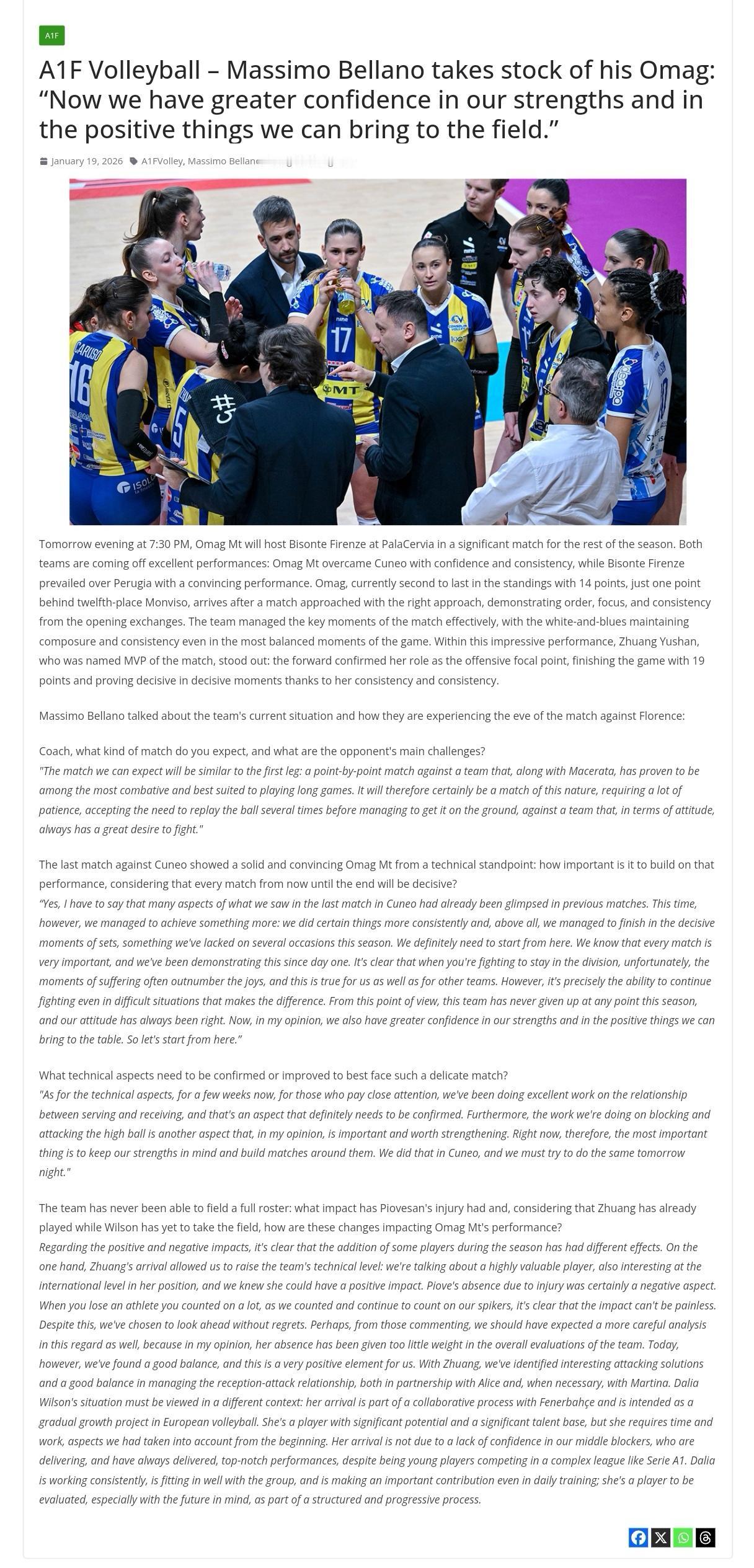 圣乔瓦尼主教练接受采访:对球队更有信心 昨天,意媒《排球杂志》以“马西莫·贝拉诺总结了他的奥马格:现在我们对自己的优势以及我们能在球场上带来的积极影响更有信心了”为题发表了对庄宇珊加盟的圣乔瓦尼奥马格山队主教练马西莫·贝拉诺的访谈: 明天晚上7点30分,奥马格山队将在帕拉切尔维亚体育馆迎战佛罗伦萨野牛队,这场比赛对本赛季剩余的比赛至关重要。两队都刚刚取得了一场精彩的胜利:奥马格山队凭借自信和稳定的发挥战胜了库内奥队,而佛罗伦萨野牛队则以一场令人信服的胜利击败了佩鲁贾队。目前排名倒数第二的奥马格山队积14分,仅落后排名第十二的蒙维索队1分。他们以正确的态度对待这场比赛,从比赛一开始就展现出了秩序、专注和稳定的发挥。球队有效地掌控了比赛的关键时刻,即使在比赛最胶着的时候,身穿蓝白球衣的奥马格山队也保持了冷静和稳定。在这场令人印象深刻的比赛中,庄雨珊表现尤为突出,她被评为本场比赛的MVP:这位前锋巩固了自己作为进攻核心的地位,全场砍下19分,并在关键时刻凭借其稳定的表现发挥了决定性作用。 马西莫·贝拉诺谈到了球队目前的状况以及他们在对阵佛罗伦萨比赛前夕的感受: 教练,您预计这场比赛会是什么样的?对手的主要挑战是什么? “我们预计这场比赛会和首回合类似:一场比分胶着的较量,对手和马切拉塔一样,都是斗志顽强、擅长打持久战的球队。因此,这肯定会是一场需要极大耐心的比赛,需要我们接受球往返多个回合才能最终得分的局面,因为对手是一支始终充满战斗欲望的球队。” 上一场对阵库内奥的比赛展现了奥马格山队在技术层面上的稳健和令人信服的表现:考虑到从现在到赛季结束的每一场比赛都至关重要,那么在此基础上继续提高有多重要? “是的,我必须说,我们在库内奥上一场比赛中看到的很多方面,其实在之前的比赛中就已经有所体现。但这一次,我们做得更多:我们在某些方面表现得更加稳定,最重要的是,我们能够在关键时刻把握住机会,而这正是我们本赛季多次缺失的。我们必须从这里开始。我们知道每一场比赛都至关重要,从赛季第一天起我们就一直在证明这一点。很明显,当你为了保级而战时,不幸的是,痛苦的时刻往往多于快乐的时刻,这对我们和其他球队来说都是如此。然而,正是这种在逆境中坚持战斗的能力决定了胜负。从这个角度来看,这支球队本赛季从未放弃过,我们的态度始终是正确的。现在,我认为我们对自身的实力和能够为球队带来的积极影响也更有信心了。所以,让我们从这里开始吧。” 为了更好地应对这场需要给予特殊关注的比赛,哪些技术方面需要加强或改进? “就技术方面而言,几周以来,我们一直在发球和接发球的配合方面下了很大功夫,这一点需要进一步巩固。此外,我们在拦网和高球进攻方面的训练也是我认为非常重要且值得加强的。因此,目前最重要的是要牢记自身优势,并围绕这些优势来制定战术。我们在库内奥的比赛中做到了这一点,明天晚上我们也要努力做到这一点。” 球队从未能够派出全部主力阵容:皮奥维桑的受伤造成了怎样的影响?考虑到庄已经上场比赛,而威尔逊尚未出场,这些人员变动对奥马格山队的表现有何影响? “就积极和消极的影响而言,很明显,赛季中期引进一些球员产生了不同的效果。一方面,庄的到来提升了球队的技术水平:她是一位极具价值的球员,在国际赛场上也颇具竞争力,我们知道她能够带来积极的影响。皮奥维桑因伤缺阵无疑是一个不利因素。当你失去一位你非常依赖的运动员时,就像我们过去和现在都非常依赖我们的主攻手一样,影响必然是巨大的。尽管如此,我们选择无怨无悔地展望未来。或许,从一些评论来看,我们应该期待在这方面得到更深入的分析,因为在我看来,在对球队的整体评价中,她的缺席并没有得到足够的重视。然而,今天我们找到了一个良好的平衡点,这对我们来说是一个非常积极的因素。通过与庄的合作,我们发现了一些有趣的进攻方案,并且在接发球和进攻之间找到了很好的平衡,无论是与布拉奇搭档,还是在必要时与纳尔多合作。达莉娅·威尔逊的情况则需要从另一个角度来看待:她的到来是与费内巴切合作计划的一部分,旨在逐步提升我们在欧洲排球的水平。她是一位潜力巨大、天赋出众的球员,但她需要时间和训练,而这些我们从一开始就考虑到了。她的到来并非因为我们对副攻手缺乏信心,尽管她们年轻,在像意甲这样竞争激烈的联赛中,她们的表现一直都很出色。达莉娅训练刻苦,融入得很好,即使在日常训练中也做出了重要贡献;她是一位需要评估的球员,尤其要着眼于未来,将其纳入一个结构化、循序渐进的培养计划中。” 圣乔瓦尼女排 意甲女排