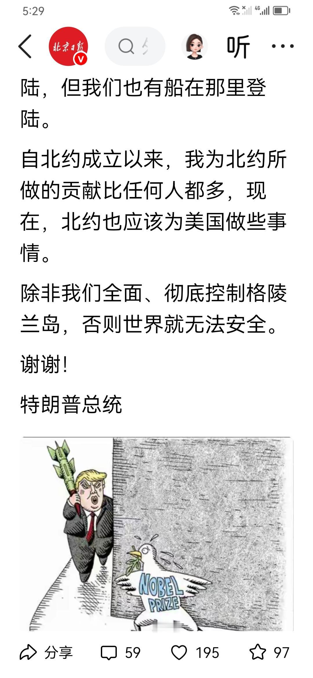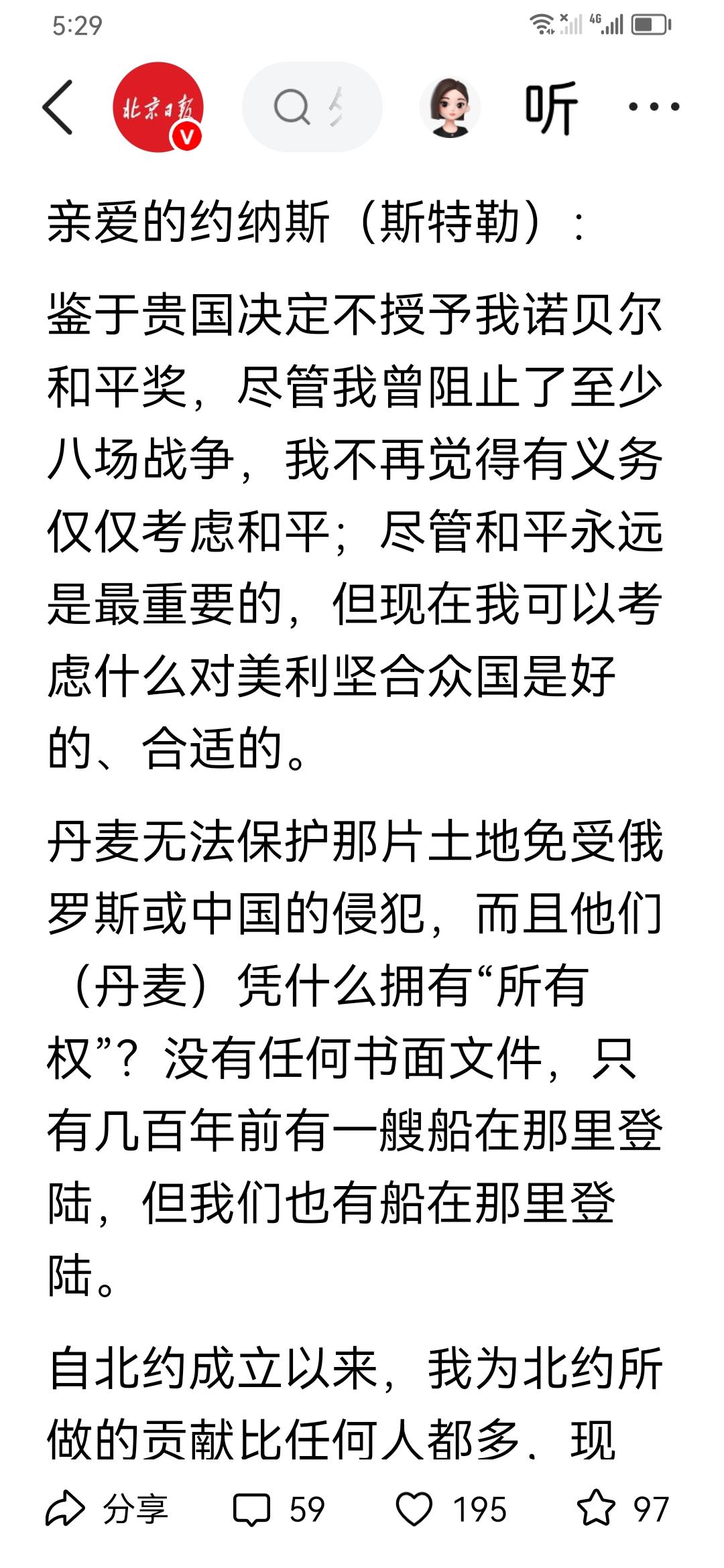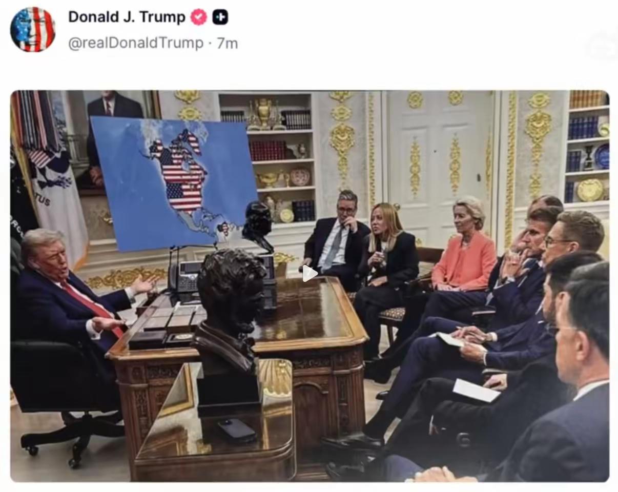 川普又插旗,又写信,又开会,准备在达沃斯会上搞定格陵兰? 主要的是与吕特谈得较好,这家伙目前没有明确反对。作为北约秘书长,前荷兰小国首相,吕特对川普是忠诚的。 冯德莱恩也一起看了那张地图,地图上美国版图已包括格陵兰、加拿大、委内瑞拉! 冯德莱恩也有呆看的份。 川普给挪威首相写的信情真意切,不无怨言:我已调停8场战争,竟然不发奖。那我只有走自己的路,自己找补。我们美国对北约贡献那么多,你们也该有回报! 川普梦中,带着哼哈二将,左万斯,右鲁比奥己将星条旗插上格陵兰。 世界风云变幻。