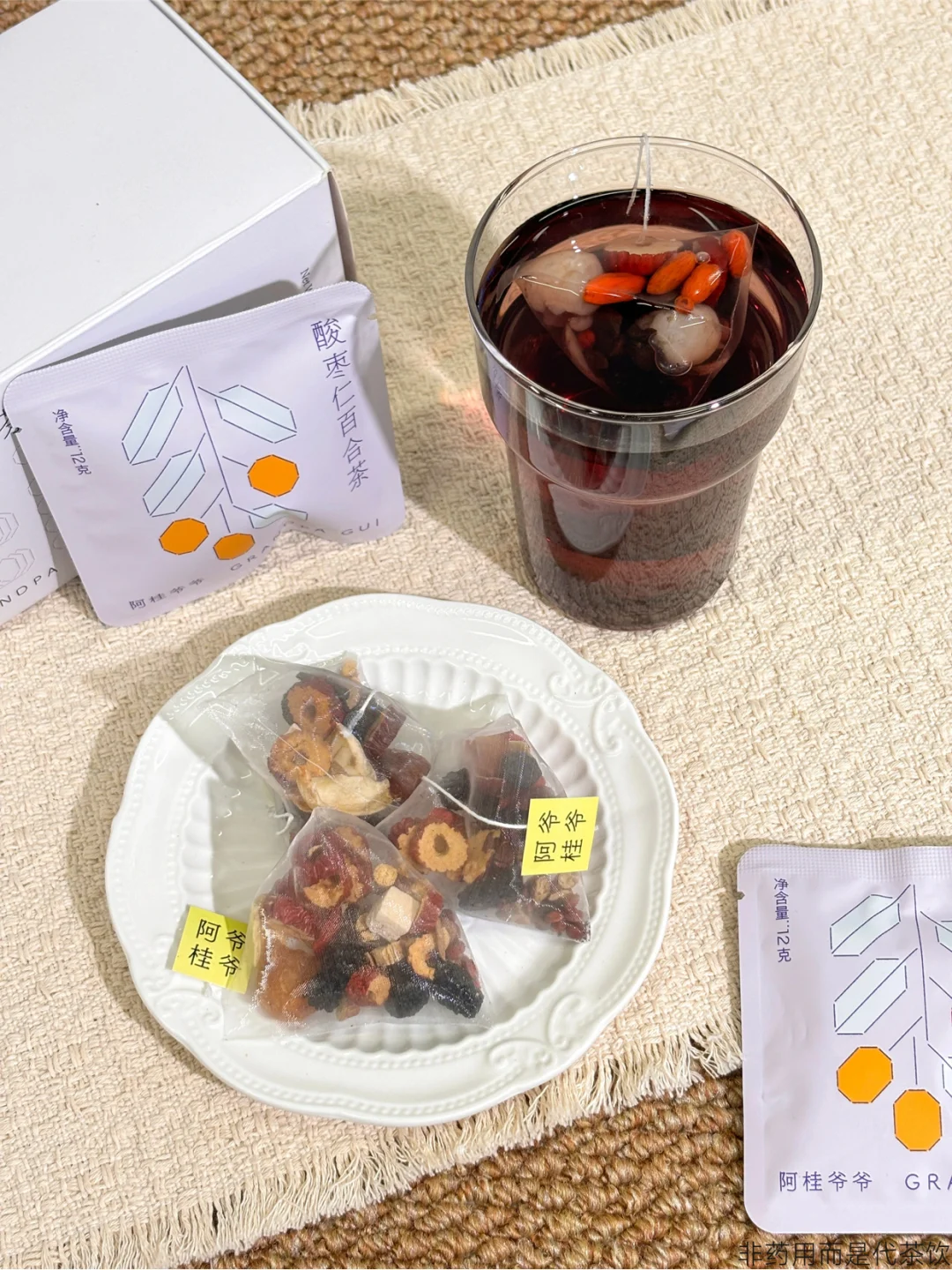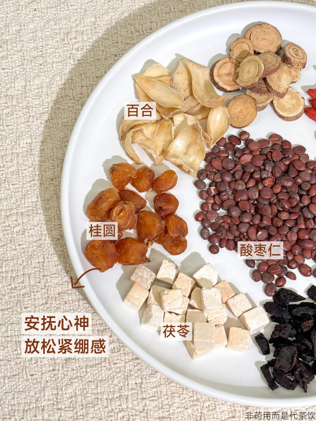茶包精选酸枣仁、百合、茯苓、桂圆、黄精等9味食材。酸枣仁,自古多用于安抚❤神,百合清润,整体搭配注重“养”与“润”。
