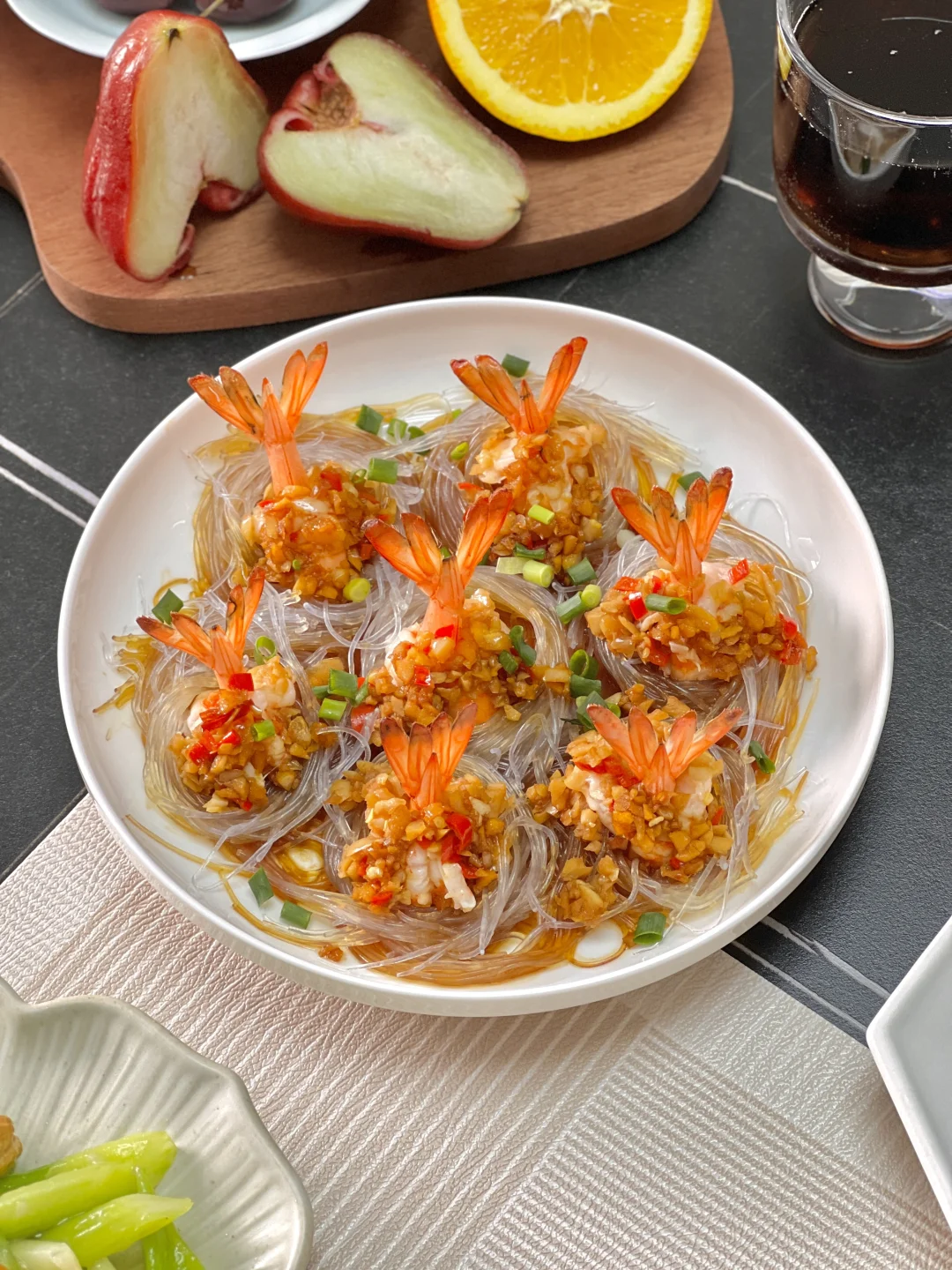 今日美食必须晒一晒!做了蒜蓉粉丝蒸虾球和零油炸脆皮五花肉。蒜蓉粉丝蒸虾球,堪称