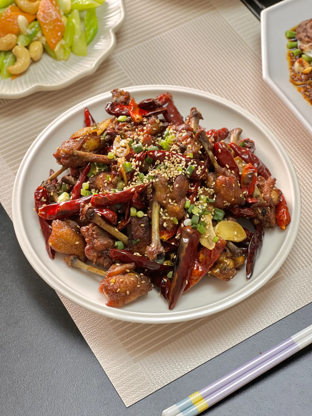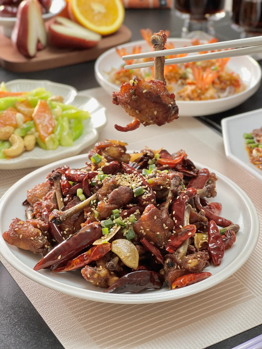 今天又做辣子鸡翅啦,麻麻辣辣的吃起来很过瘾~还有蒜蓉粉丝虾,即使是不常做饭的小伙伴也能很轻松做好哒,可以多准备点粉丝和蒜蓉酱,拌在一起也太好吃了吧[派对R] 【辣子鸡翅】 【蒜蓉粉丝虾】 【豇豆藕片拌牛肉】 【腰果西芹】