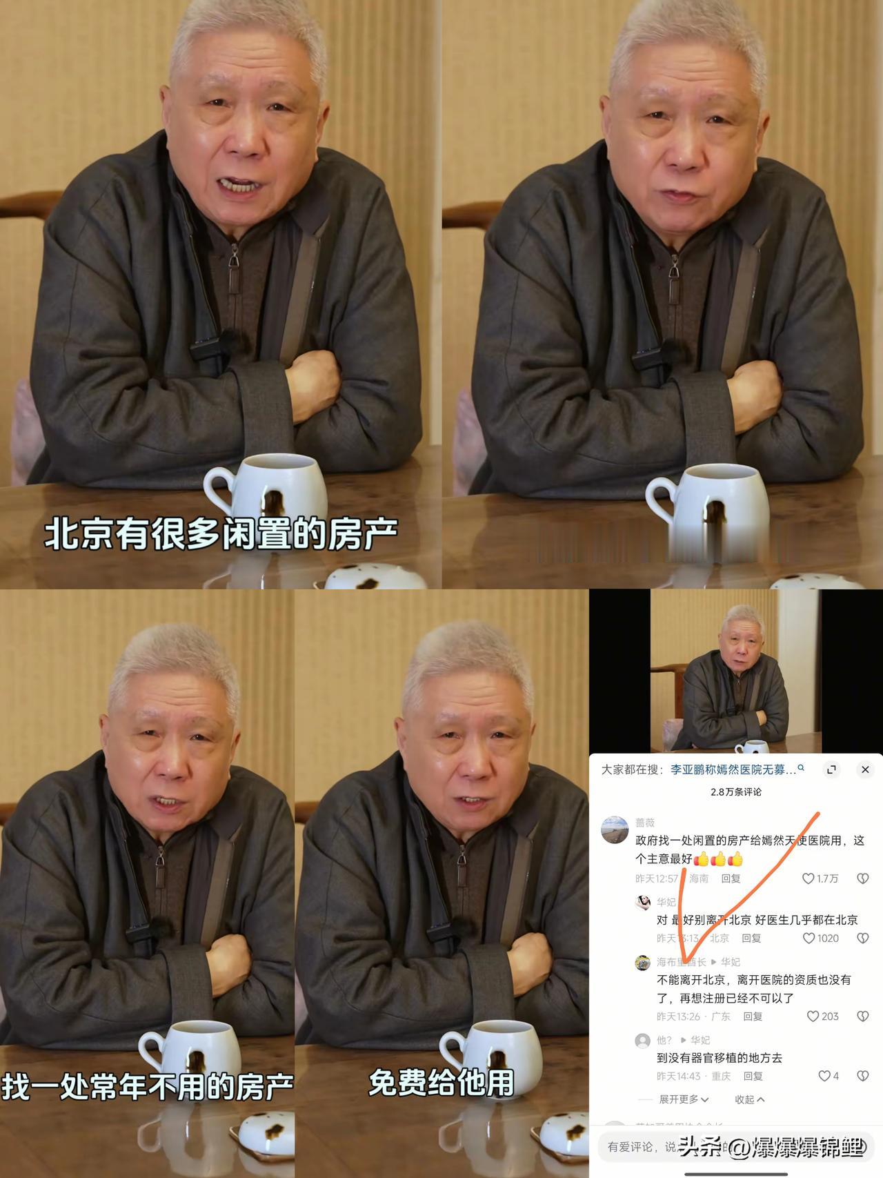 马未都这回是为了李亚鹏,也为了那帮看病难的孩子,真是豁出老脸喊话了。 直接点名让当局给嫣然医院找个免费的落脚地,理由也硬气:北京闲置房产那么多,空着也是空着! 这话听着是真解气。 咱们平时看着那些空荡荡的大楼也是心疼,资源浪费在那,不如给公益机构雪中送炭。 你看评论区里那个高赞说的,简直是把大伙心里的算盘都打明白了。 现在这世道,做点好事还要为房租发愁,确实让人心里不是滋味。 要是真能把这闲置资源利用起来,给医院省点钱救孩子,那才叫实打实的政绩。 网友们这波疯狂点赞,不就是盼着这点温情能落地吗?