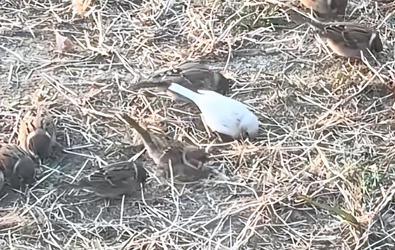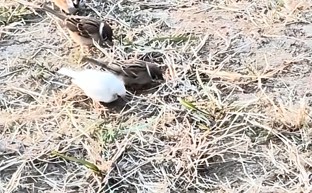 大吉大利,祥瑞之兆啊。 2025年12月27日,山东网友“小草睡着了”无意中朝楼下草坪看了一眼,惊奇地发现枯黄的草坪上,十几只麻雀正在啄食草籽,里面竟然混着一只纯白色的个体,活脱脱一个糯米团子。有些网友说是虎皮鹦鹉,但是我告诉大家,鹦鹉隆冬在野外是无法存活的。 顺带给大家讲一个故事,传说麻雀永远都是蹦跶,从来不会走路,如果看到麻雀走路,这个人可以当皇上,不信大家可以留意下。