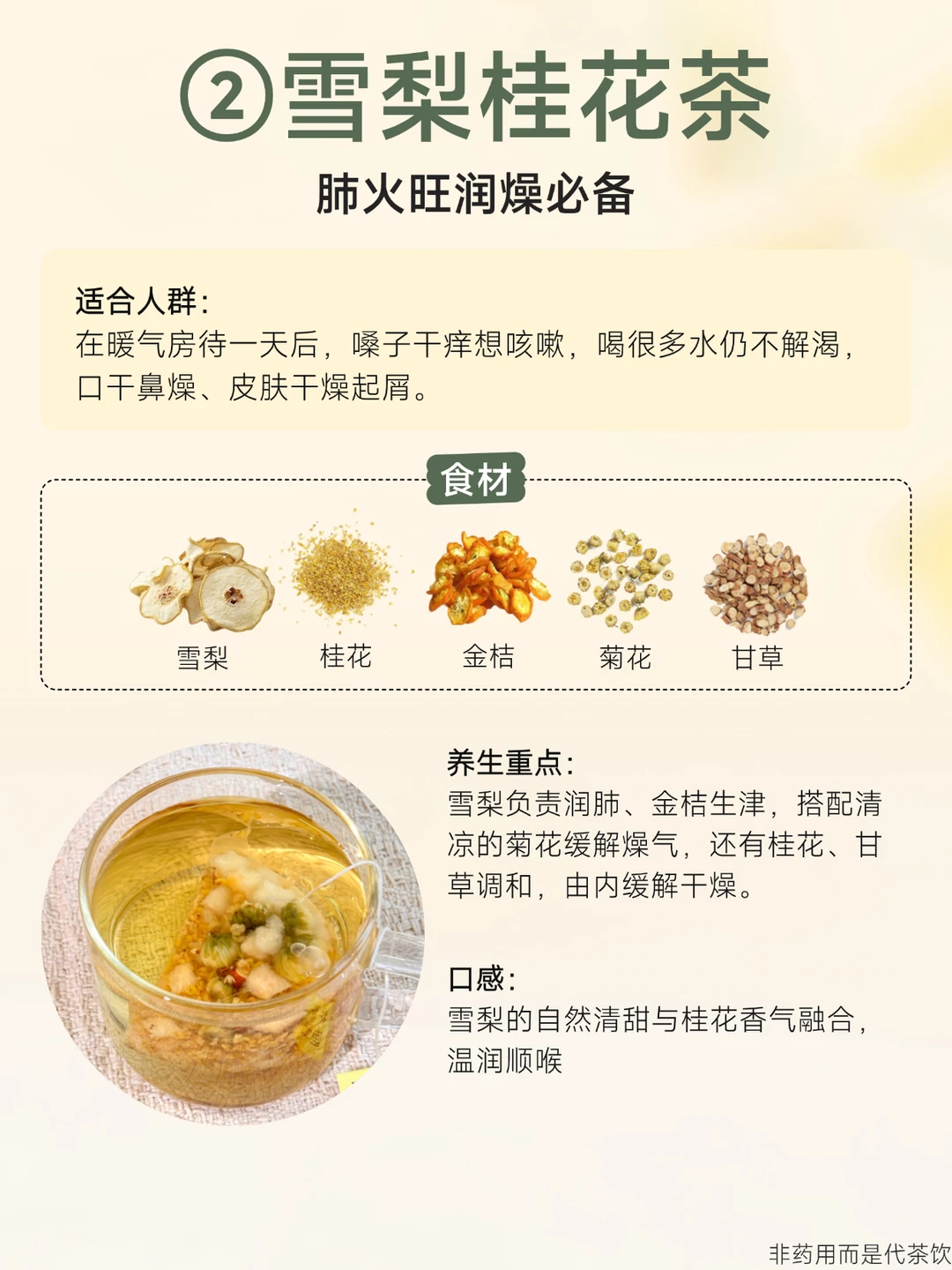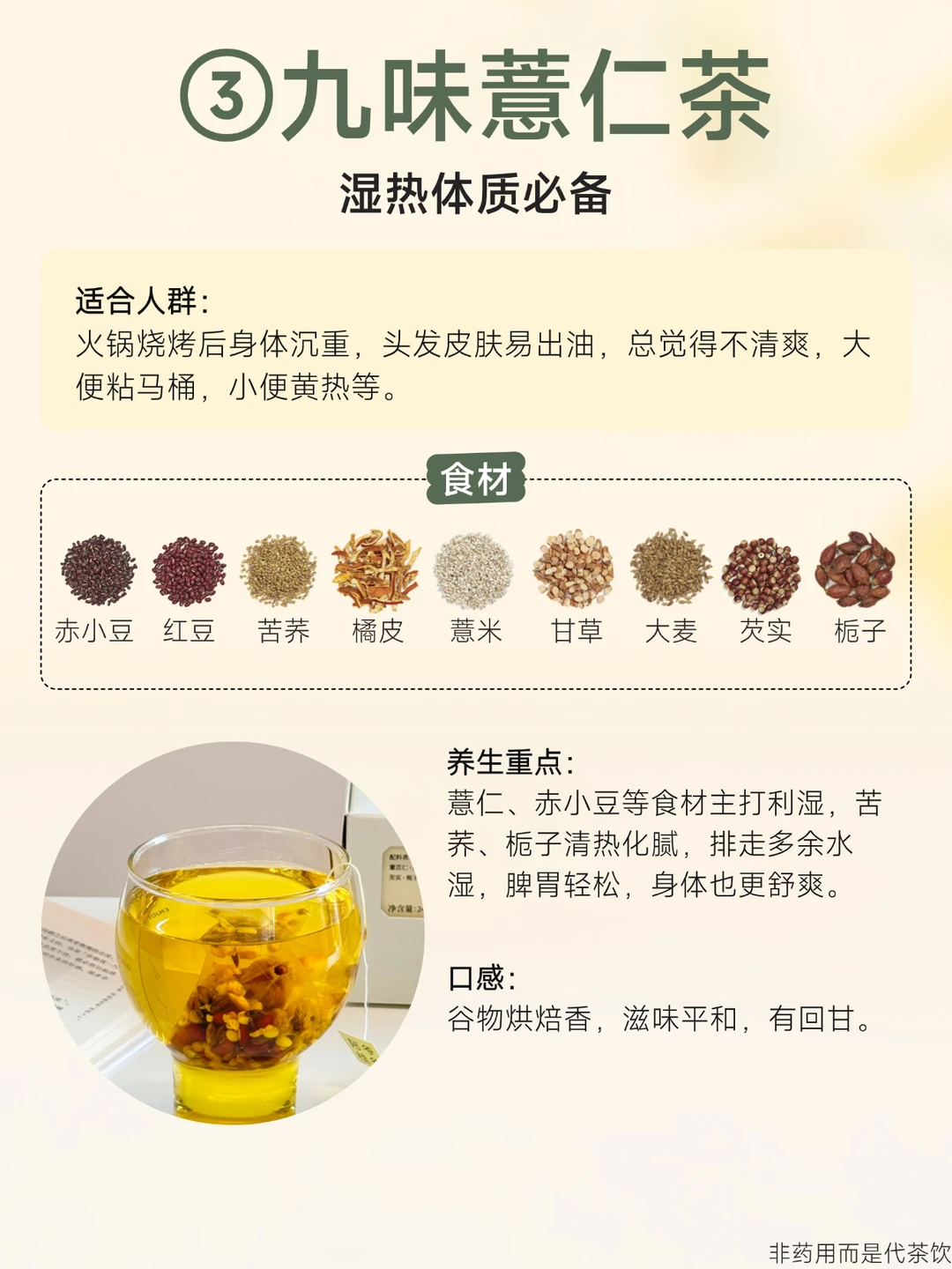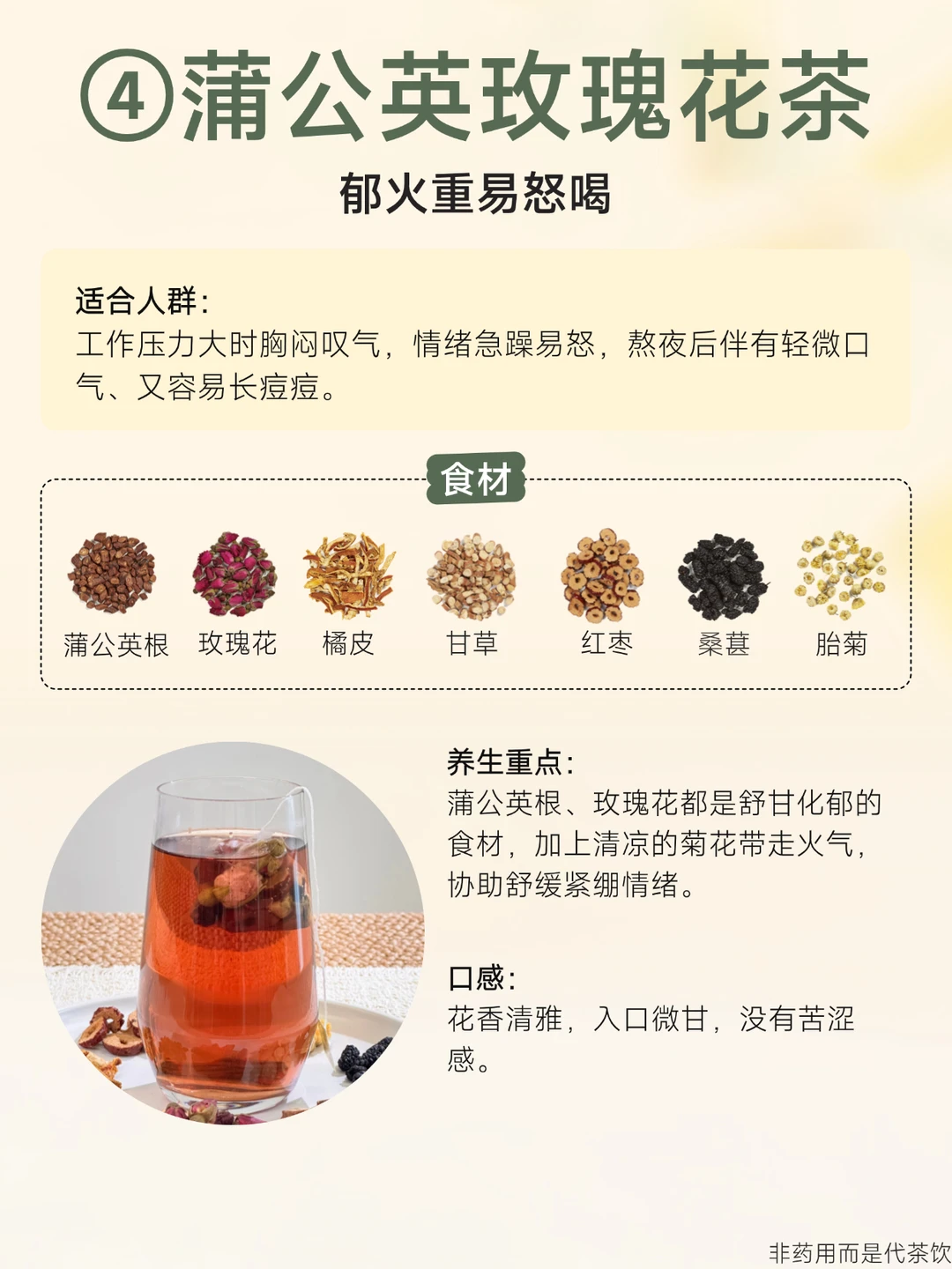 很多男生一到冬天就浑身发燥 特别是北方地区久待暖气房的 又常熬夜,加上工作压力大、情绪烦躁... 身体里好像有几把不同的“火”在窜 喝对一杯茶,比猛灌凉茶管用得多~ 🍵熬夜养甘茶:熬夜上火喝 🍵雪梨桂花茶:肺火旺喝 🍵九味薏仁茶:湿热体质喝 🍵蒲公英玫瑰花茶:情绪烦躁喝 冬天干燥,别让“火”越烧越旺 每款都是独立茶包,办公桌抽屉常备 随时给自己“降降温”~ - 非药用而是代茶饮