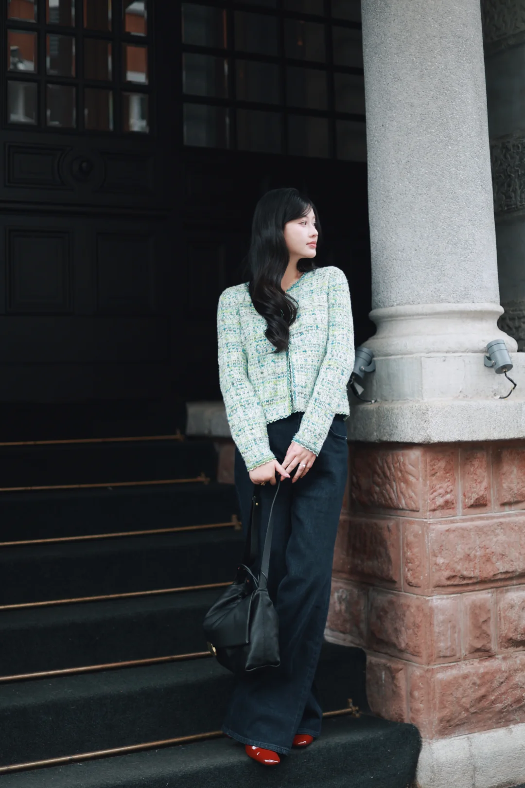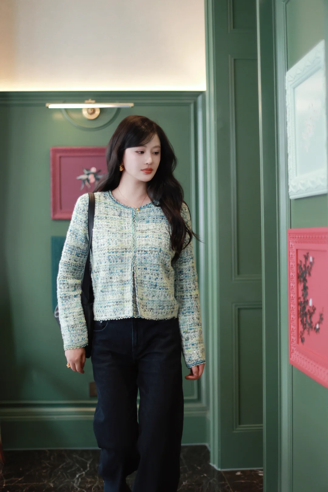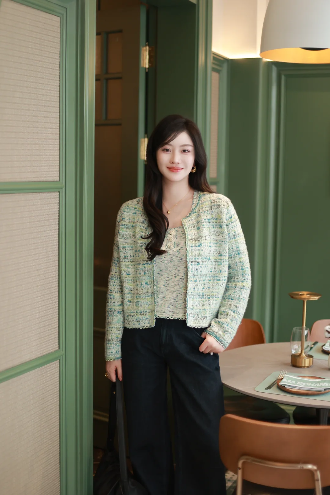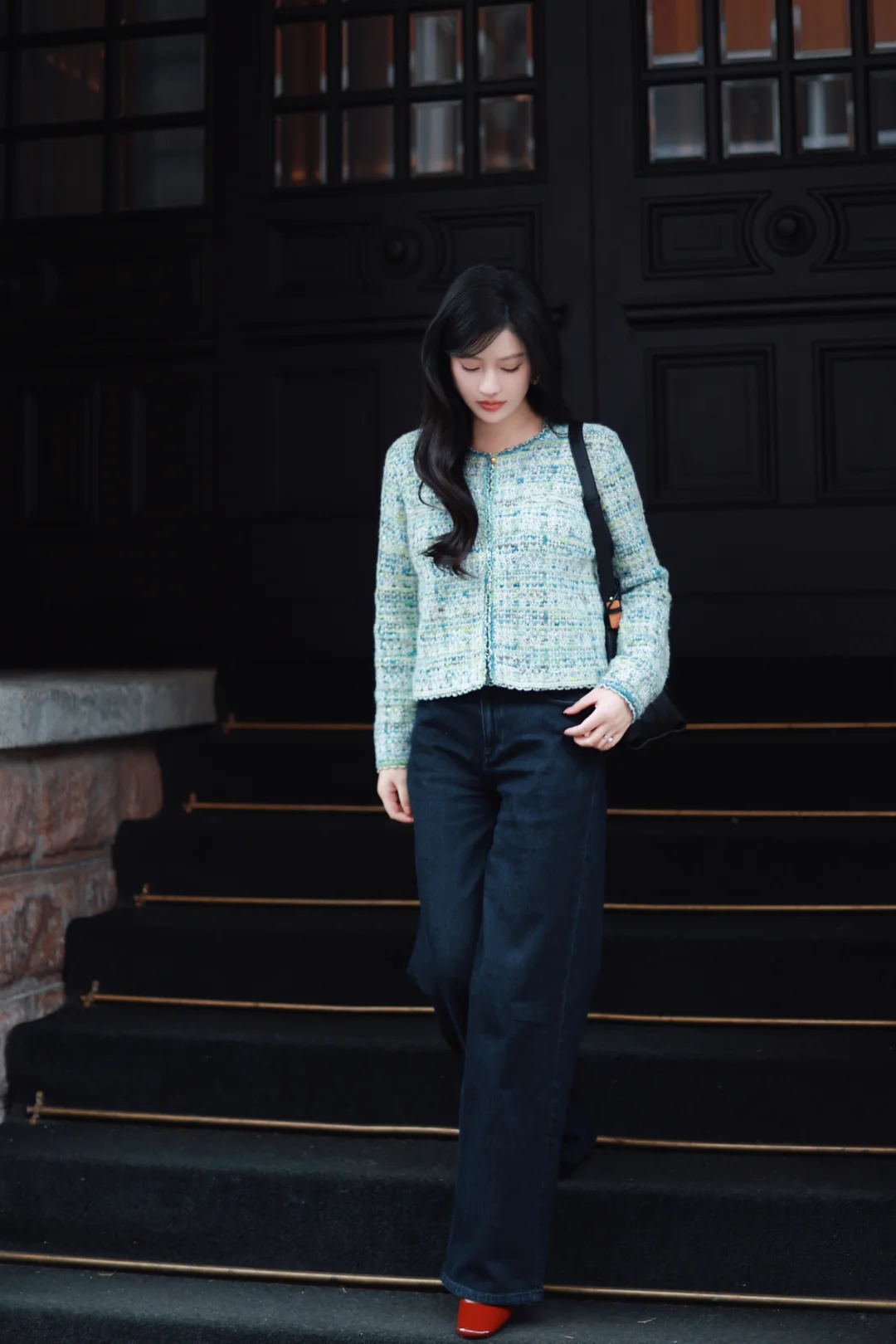 一个女人,一旦接触了斜刘海,就像鱼儿接触了水。 📝今日OOTD拆解 ▫️上衣:薄荷绿小香风短外套+同色系蕾丝边背心内搭 软fufu的混色编织纹理,自带柔光滤镜,短款版型刚好能拉高腰线,给下装拉长的空间。 ▫️下装:深色直筒牛仔裤 +酒红玛丽珍鞋 万能显瘦神裤垂感绝了,中和了上衣的甜腻感,休闲又精致。 咱的新发型+新穿搭都就位,就等一场初雪和热红酒,一个女人岁末的快乐就是这么简单。