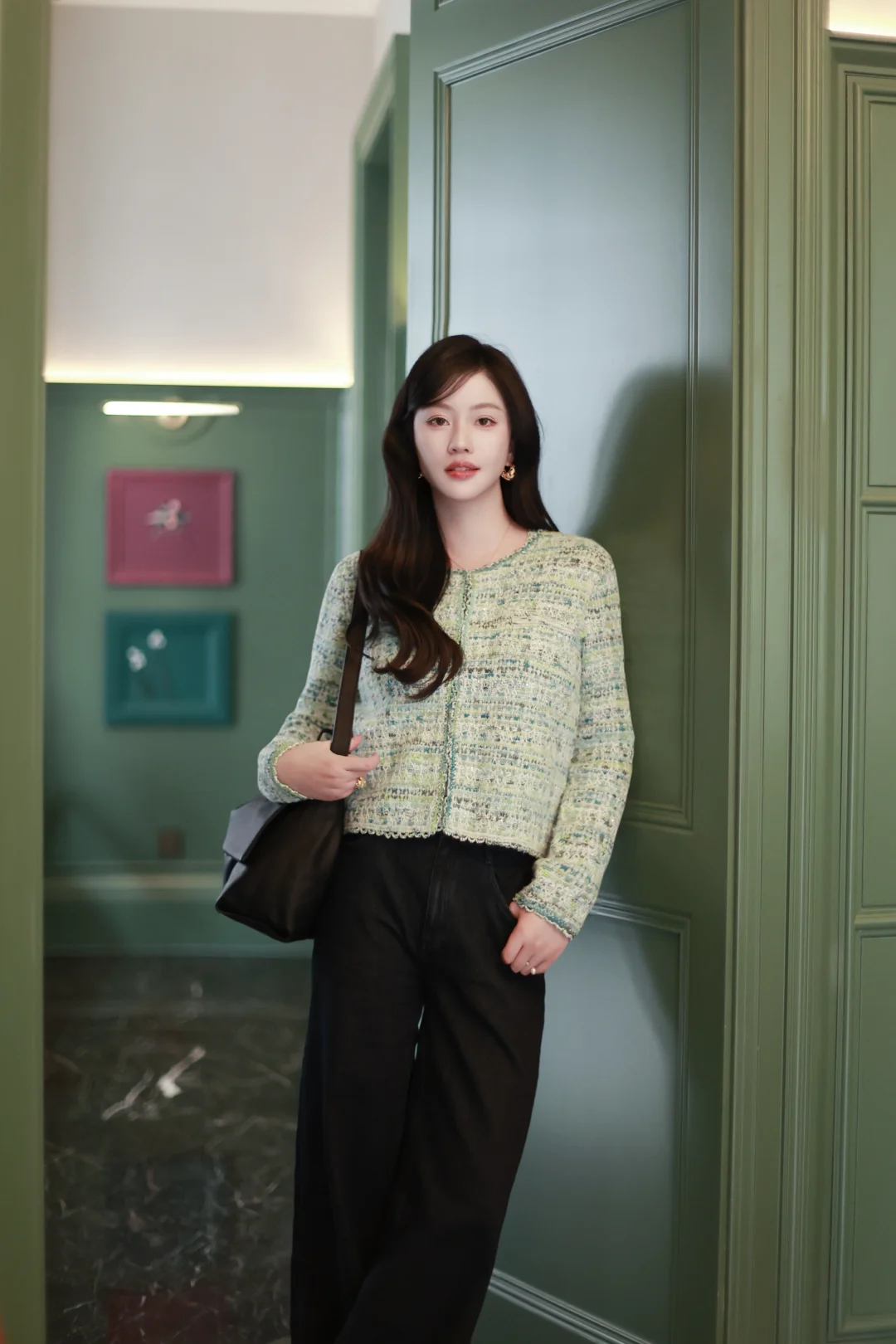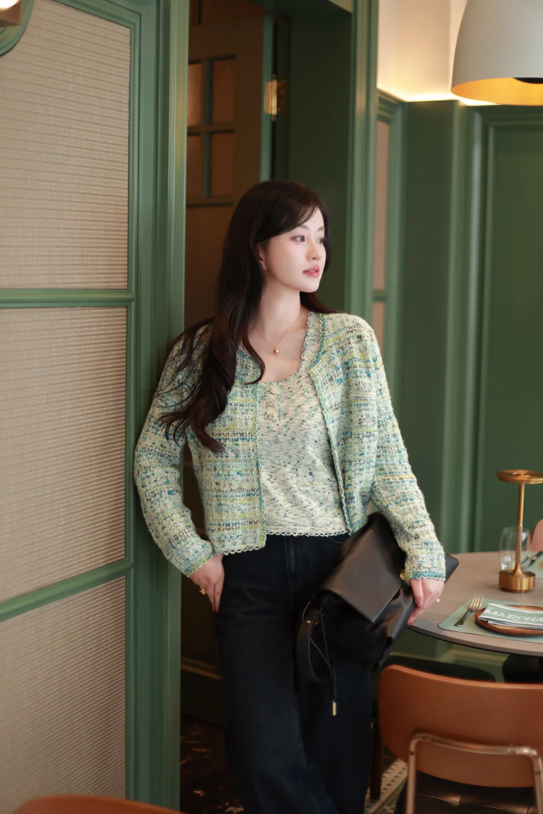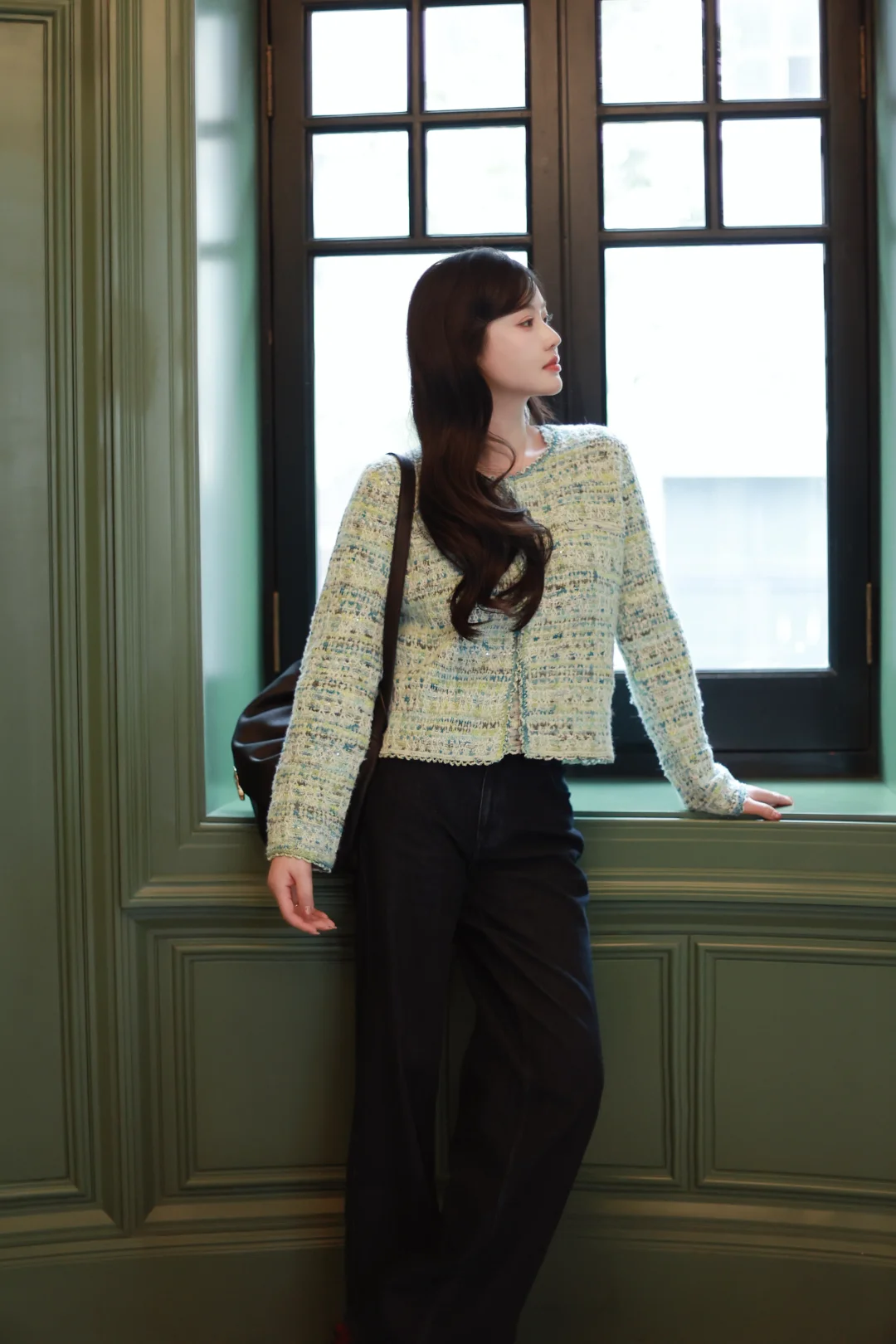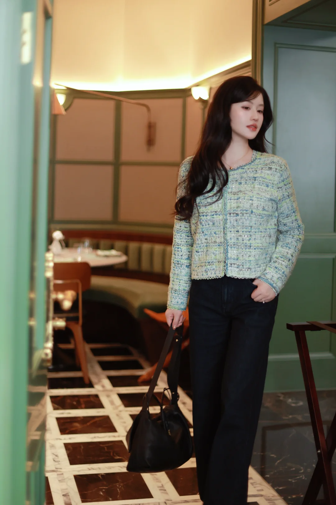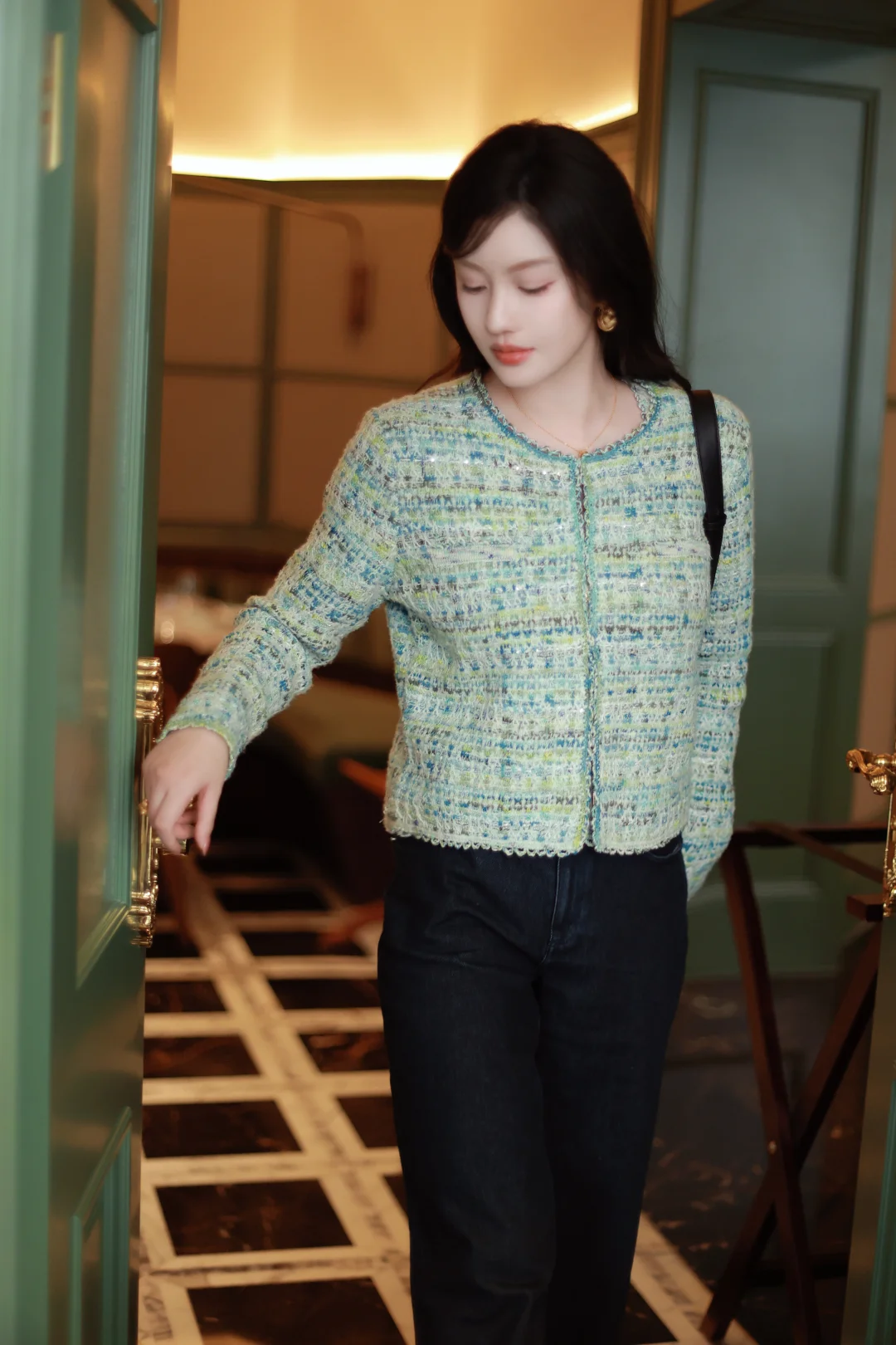 一个女人,一旦接触了斜刘海,就像鱼儿接触了水。 📝今日OOTD拆解 ▫️上衣:薄荷绿小香风短外套+同色系蕾丝边背心内搭 软fufu的混色编织纹理,自带柔光滤镜,短款版型刚好能拉高腰线,给下装拉长的空间。 ▫️下装:深色直筒牛仔裤 +酒红玛丽珍鞋 万能显瘦神裤垂感绝了,中和了上衣的甜腻感,休闲又精致。 咱的新发型+新穿搭都就位,就等一场初雪和热红酒,一个女人岁末的快乐就是这么简单。