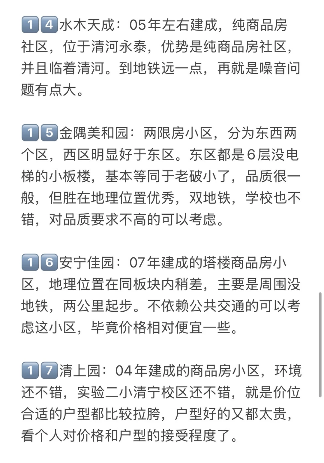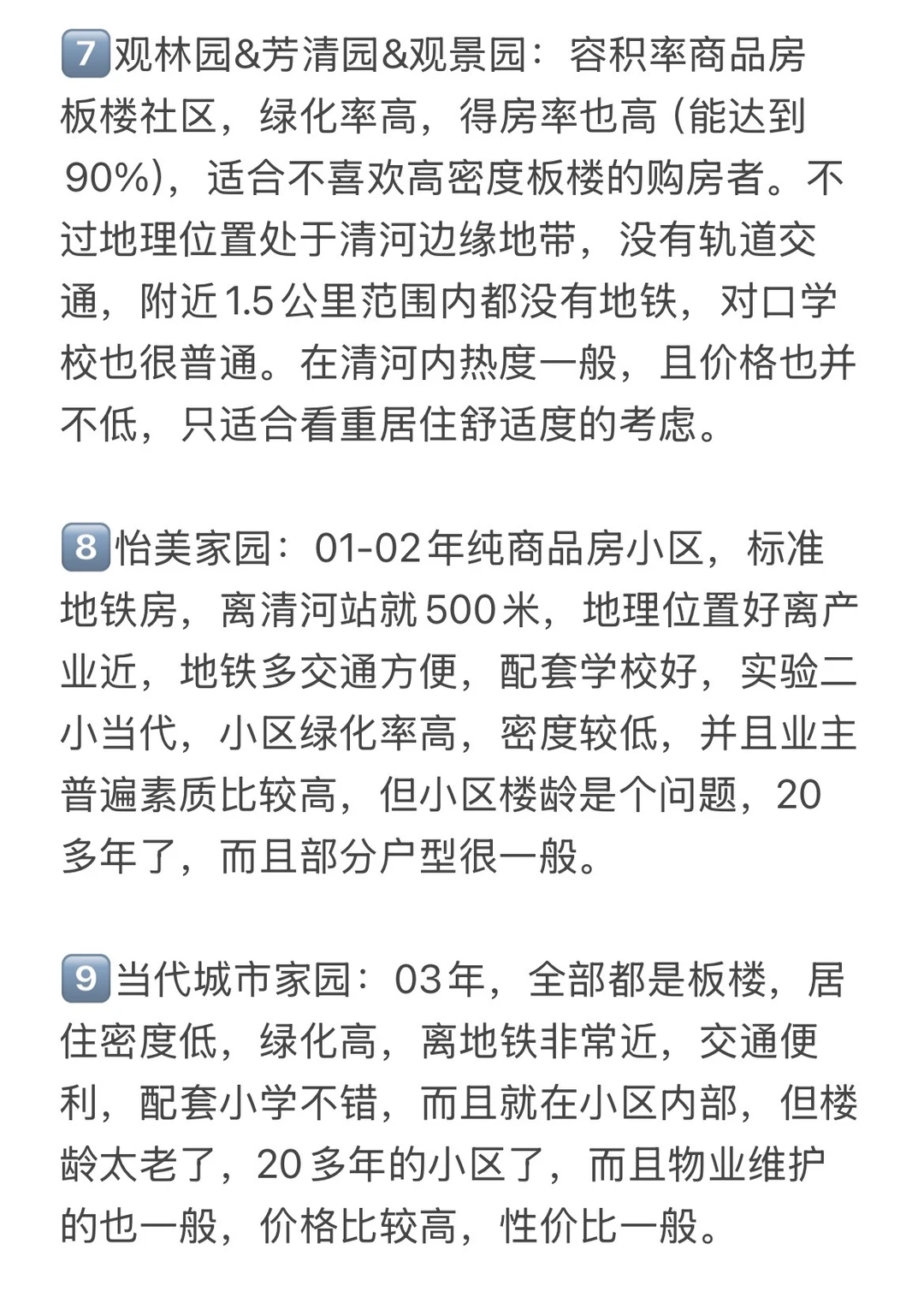 2️⃣ 怡美家园:01-02年纯商品房小区,标准地铁房,离清河站就500米,地理位置好离产业近,地铁多交通方便,配套学校好,实验二小当代,小区绿化率高,密度较低,并且业主普遍素质比较高,但小区楼龄是个问题,20多年了,而且部分户型很一般。
