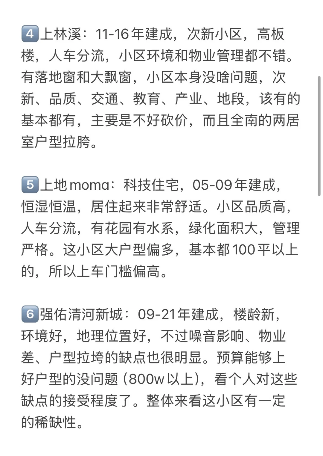 5️⃣清景园:06年建成,小区不大,都是带电梯的高板楼,生活配套、教育配套、交通配套都没毛病,但是和强佑一样噪音是个问题。并且二类经适房,户型普遍不咋样,并且没转商的话还有额外的税费。