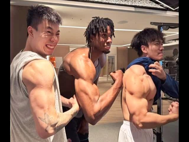 看看张镇麟这肌肉,亚洲第一替补锋线稳了吧? 张镇麟和怀特塞德以及训练师在健身房