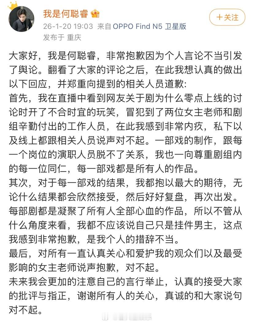 何聪睿道歉了何聪睿为个人言论道歉何聪睿发文回应争议