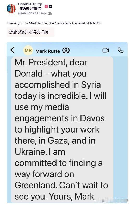 当特朗普与北约秘书长吕特就格林兰岛问题会谈后,转背就把这干儿子发给他的短信发到了社交网络平台上。 这些欧美政治精英们的交流原来就是舔和被舔。 大殖子们心中的“国际社会”和“现代人类文明”终于癫成了东大不敢相信的样子…欧洲真是完蛋了……