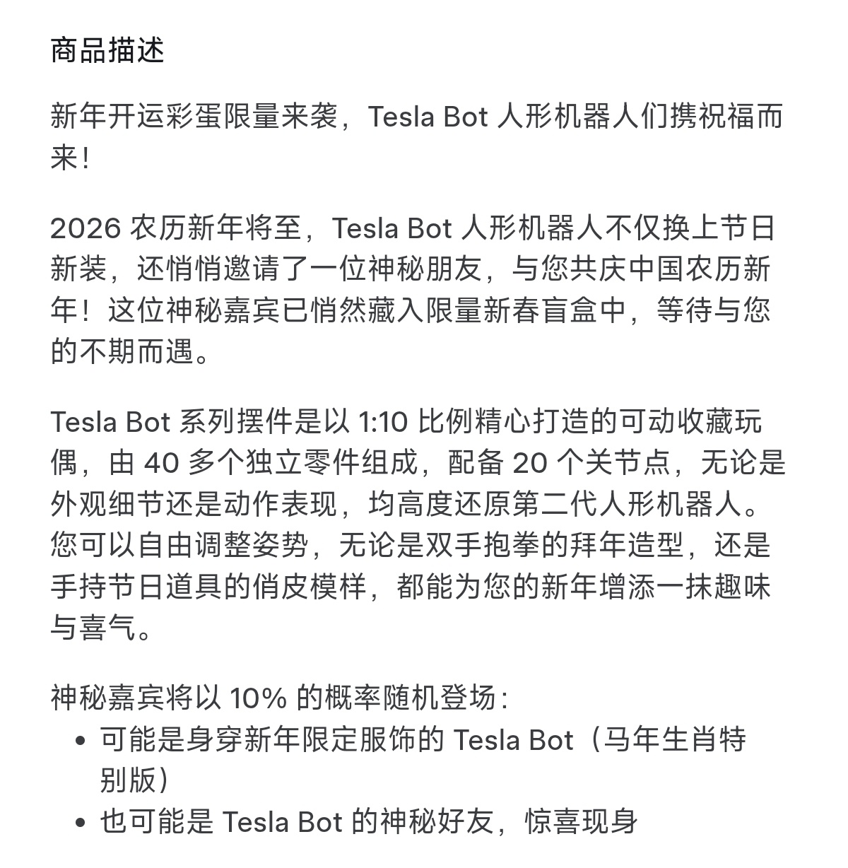 特斯拉中国上架199元TeslaBot摆件特斯拉商城推出Tesla Bot摆件,而且是盲盒款,有10%的概率拿到马年生肖特别款或者是Tesla Bot的神秘朋友。199元的价格还不错,放家里或者车上当个摆件还行。