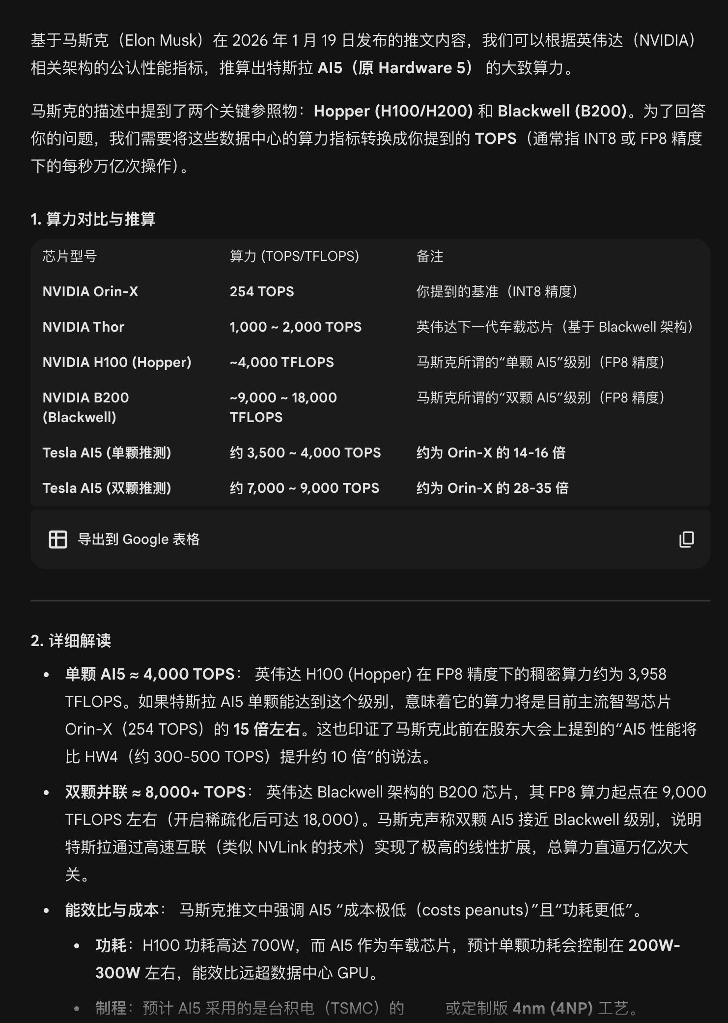 特斯拉AI5芯片算力有多少?马斯克的描述中提到了两个关键参照物:Hopper (H100/H200) 和 Blackwell (B200)。让AI将这些数据中心的算力指标转换成 TOPS(通常指 INT8 或 FP8 精度下的每秒万亿次操作)。这样很惊人啊,单颗 AI5 ≈ 4,000 TOPS: 英伟达 H100 (Hopper) 在 FP8 精度下的稠密算力约为 3,958 TFLOPS。如果特斯拉 AI5 单颗能达到这个级别,意味着它的算力将是目前主流智驾芯片 Orin-X(254 TOPS)的 15 倍左右。这也印证了马斯克此前在股东大会上提到的“AI5 性能将比 HW4(约 300-500 TOPS)提升约 10 倍”的说法