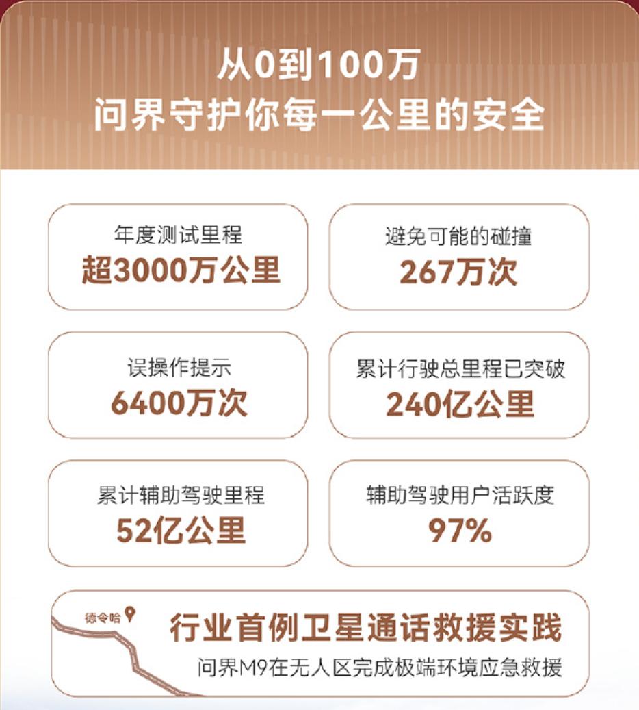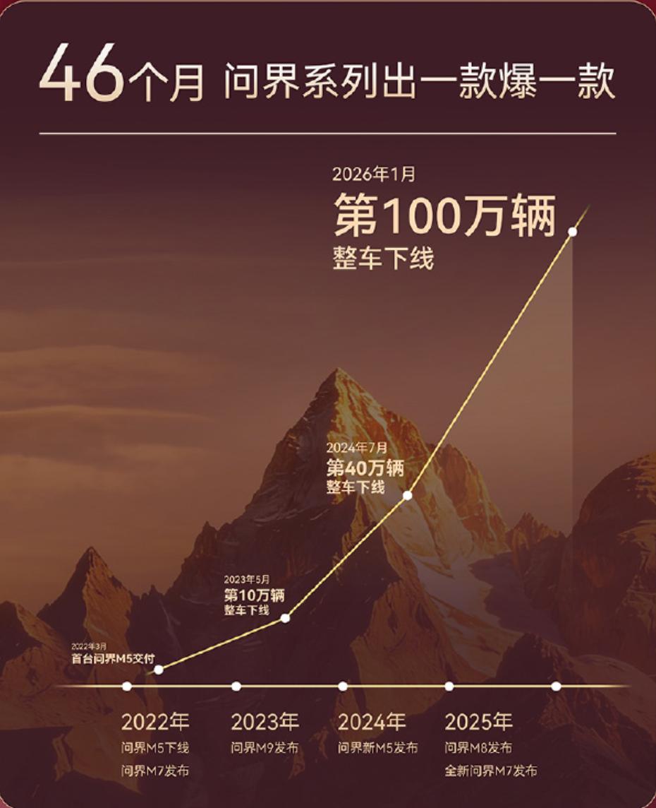问界百万之路,是问界品牌的向上成长之路,也是国产汽车品牌攻坚豪华市场的缩影! 跟很多国产品牌的成长历程类似,问界的成功也并非一帆风顺。 早期的M5和M7其实销量很惨淡,在之前的新势力榜单上也难觅踪影。 在新M7发布后,问界开始腾飞之路。之后发布的每一款车型,可以说都是爆款。问界也一路拿下各个市场的冠军! 问界M9拿下50万+市场冠军,M8拿下40万+市场冠军,M7拿下30万+市场冠军! 问界品牌在30万+市场真正做到了一统天下,也是第一个真正意义上拿下豪华市场的国产品牌! 伴随着销量的提升,用户的口碑也日渐高涨,在NPS和保值率方面也处于第一梯队: 问界品牌净推荐值第一、问界品牌信心发展指数第一、问界M9获得车型总榜净推荐值第一 & 保值率第一,各种荣誉数不胜数! 问界的百万之路,也是跨界融合新模式的典范。 如今的鸿蒙智行可以说是汽车行业,甚至是整个中国工业历史上最成功的跨界合作案例了,对整个国产汽车行业的发展意义非凡。而问界就是鸿蒙智行的标杆,正是因为问界的成功,让业界看到了跨界融合的巨大威力,也极大加速了鸿蒙智行的发展脚步。即便是当下,问界在鸿蒙智行体系内依然是老大哥的角色。 第一个100万,问界用了5年。 接下来两年,问界将全力拿下第二个100万!