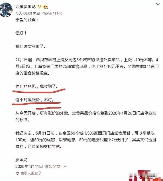 互联网有记忆真好,回旋镖从来不虚发。 口罩期间,餐饮企业特别不容易,贾国龙第一个出来叫苦,后来,消费者纷纷到店支持,可换来的却是西贝涨价,一份馒头卖到21块。消费者嫌贵,副总裁放言月薪5000以下不该吃西贝,把西贝的高端形象定得死死的。 把消费者的体验放在第一位,是很多餐饮店生存法则,但好像被西贝忽略了,贾国龙认为,西贝大面积闭店是因为罗永浩,却从来不听听消费者的心声,大家是不认可预制菜吗?大家是不想花现炒菜的钱,买几个月甚至更长时间做好的菜,这才是顾客不愿再去西贝的主要原因,和罗永浩有什么关系?贾国龙却有意无意忽略了。 贾国龙一边说,西北肩负着1万多名员工的生计,好像特别关心员工的生活,特别有社会责任感,一边却嫌996不够,要715才行,一周上七天班,每天15个小时,然后还要乐在其中,开开心心,享受辛苦,不要苦哈哈。 现在西贝遇到前所未有的危机,贾国龙却还在我行我素,遇到危机时搬出员工,不能让他们失业,危机解除715。一个创始人忽视员工,忽视消费者的企业,真的可以走的更远吗?