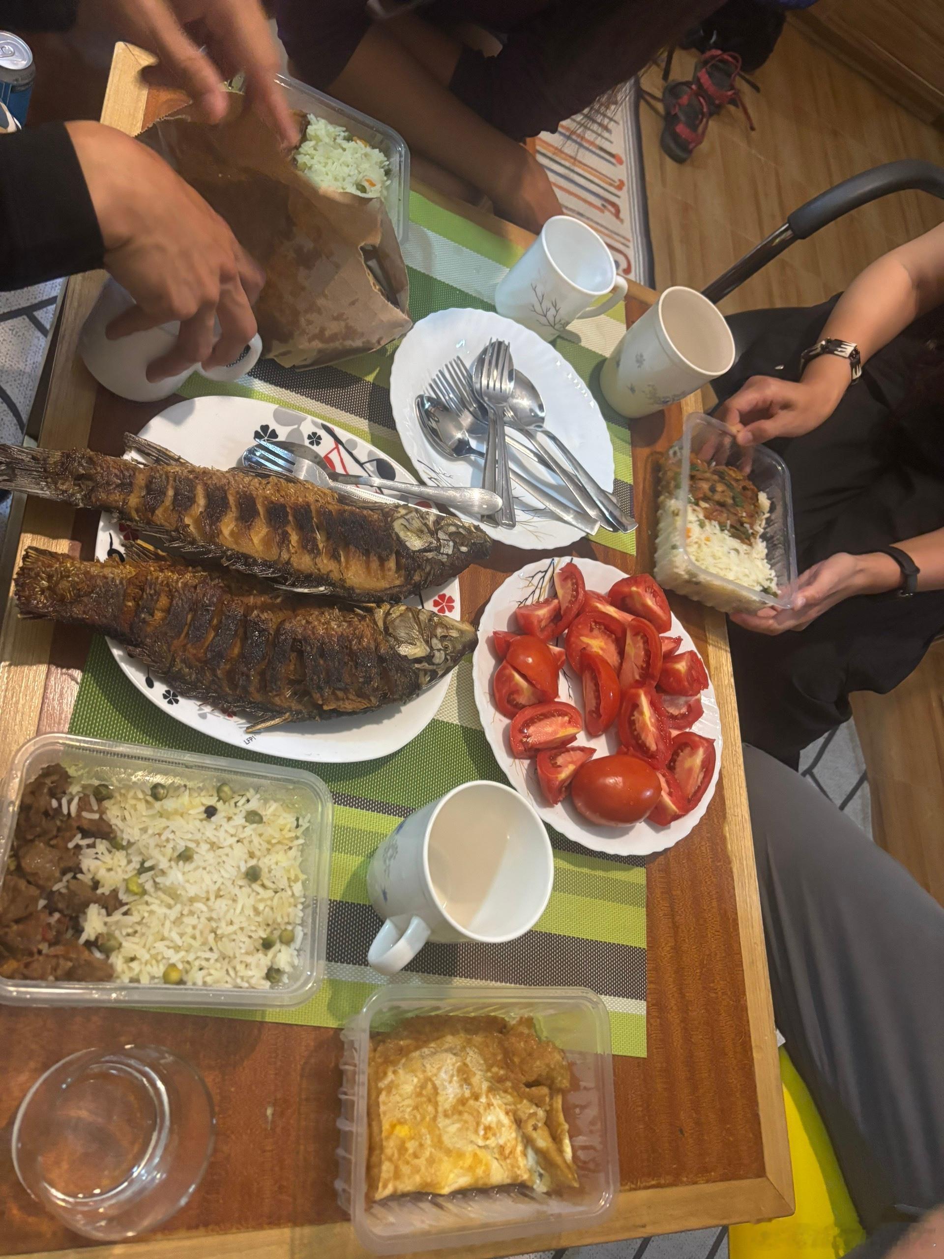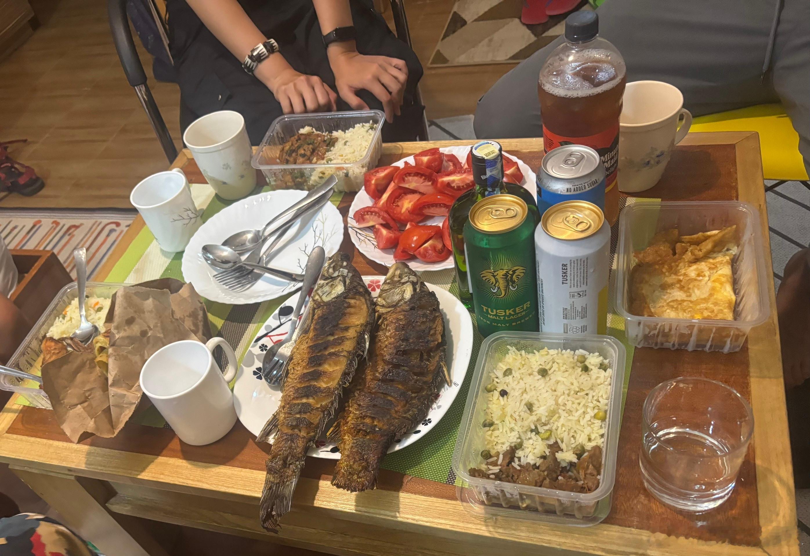 这是我们5个搭子,在肯尼亚的散伙饭,小闫夫妇明天回内罗毕,元旦的飞机回国,我跟老蔡两口子继续去乌干达,我们外带了两份牛肉饭,一份鸡肉饭,买了三种啤酒一种白酒,又买了两个煎蛋和几张薄饼,那两条煎鱼很便宜,大约十几块人民币一条,味道还不错,还买了西红柿和红萝卜,我们自己diy了晚餐,有酒有肉有故事,这才是旅行该有的姿态吧!大家吃的挺开心,相逢何必曾相识,同时非洲流浪人! 坦桑尼亚