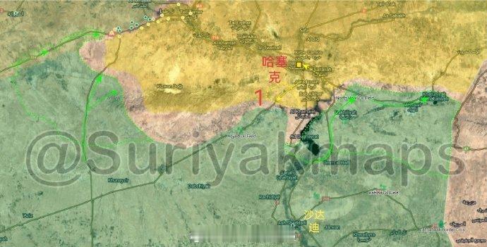 截至1月20日下午14点叙利亚局势: 1.阿勒颇省和拉卡省前线: 从夜间到清晨,尽管遭遇“人民保护部队”(库尔德武装组成)的抵抗,但叙利亚过渡政府军仍继续向M-4高速公路推进并取得了进展。目前,双方的冲突仍在继续(图一)。 2.哈塞克省前线: 自昨日起,叙利亚过渡政府军从三个方向向哈塞克省推进(图二)。同时,“叙利亚民主军”在哈塞克市以南发起反击以缓解压力,重新夺回了特尔·巴鲁德镇(图二1)。