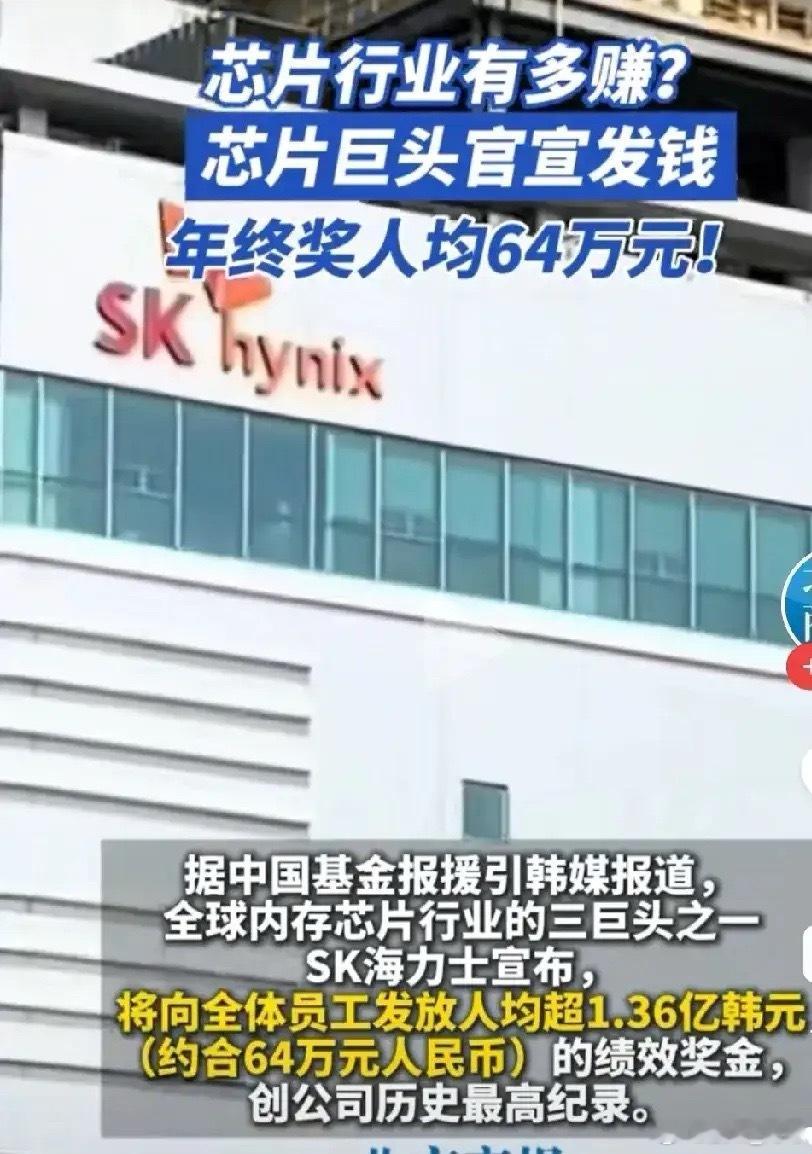 太土豪了!芯片巨头年终奖人均64万!内存芯片巨头海力士由于内存芯片涨价,业绩大幅