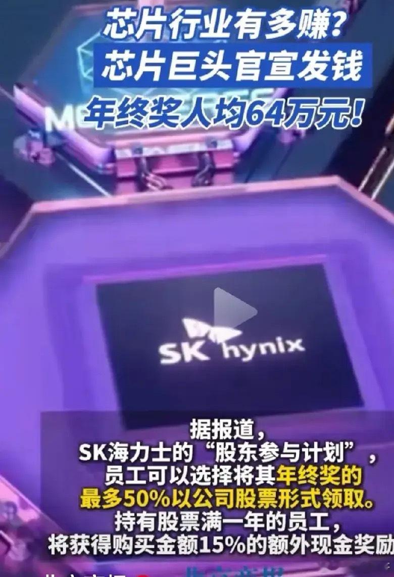 太土豪了!芯片巨头年终奖人均64万!内存芯片巨头海力士由于内存芯片涨价,业绩大幅度上涨,而海力士到了年底,也土豪的推出人均64万元的年终奖,也是有点太土豪了。大概从去年以来,由于AI人工智能等需求暴增,内存芯片也开始大幅度上涨,而海力士做为全球三大内存芯片厂家,也在这一波内存上涨中赚的盆满钵满,股价也大幅度上涨了275%。从上面就可以看出来,芯片产业做好了,那可是真赚钱啊,而且员工工资也很高,可以提供大量的高薪岗位,而这可能也就难怪某国总是想霸着高端芯片产业,想出来各种方法,出台了多轮限制措施,想限制中国芯片产业的发展了。而从现在来看,近些年来,我国已经在芯片产业中投入大量资金,大量研发人员也正在加快研发高端芯片相关技术,我国芯片产业也在快速进步,可以预见,再等个几年时间,我国芯片产业也必将发展更好,具备更强的竞争力,其他国家再想打压可能也压不住了。而一旦我国芯片产业足够强了,逐渐具备与某国高端芯片竞争的实力,那么我国人工智能等相关产业也将发展更快,我国芯片出口可能将更多,而此消彼长之下,某国可能就更加郁闷了。