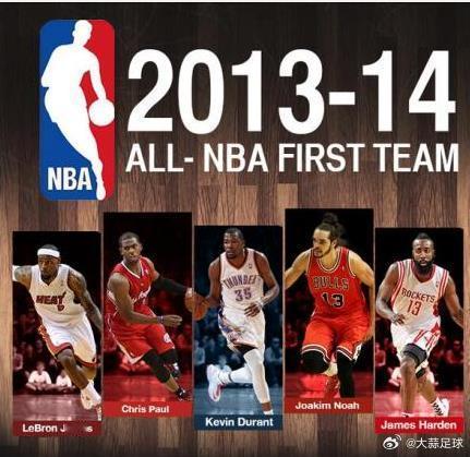 【NBA官方公布最佳阵容】北京时间6月5日,NBA官方公布了本赛季的最佳阵容,入选第一阵容的为:詹姆斯、杜兰特、保罗、哈登、诺阿。第二阵容:霍华德、格里芬、勒夫、库里、帕克。三阵:艾尔-杰弗森、阿尔德里奇、保罗-乔治、德拉季奇、利拉德。